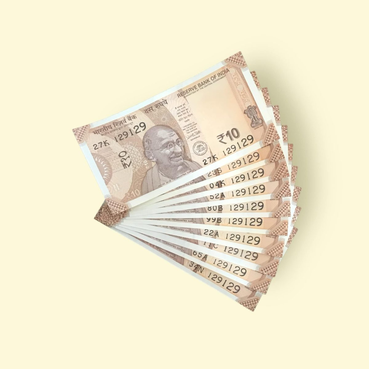 RS 10/- INDIA BANK NOTE 10 NOTE SAME NUMBER SET 129129 GEM UNC