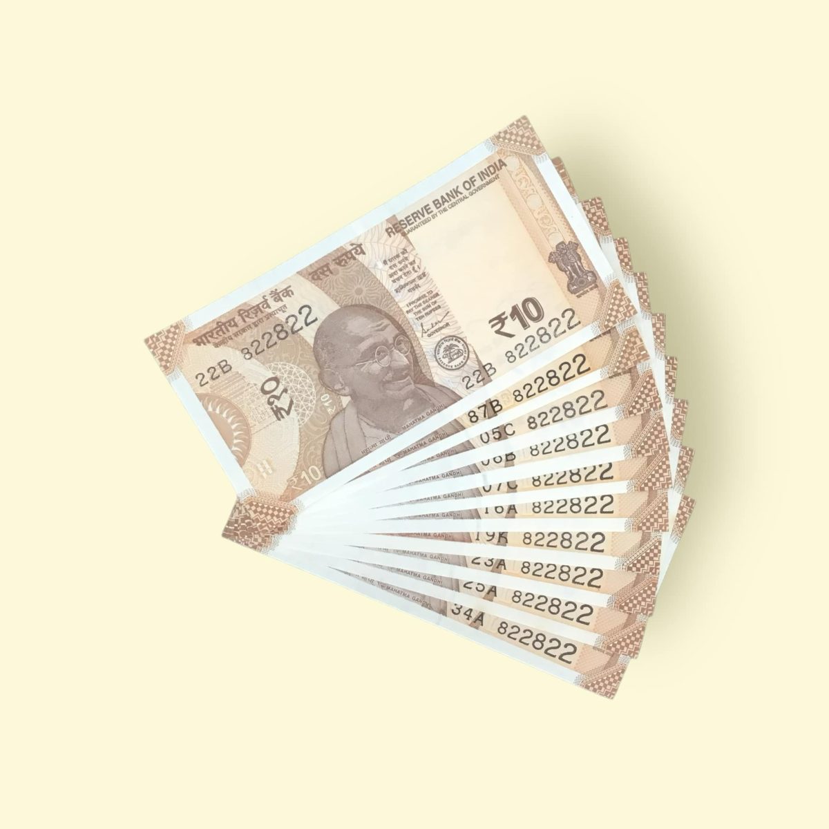 RS 10/- INDIA BANK NOTE 10 NOTE SAME NUMBER SET 822822 GEM UNC