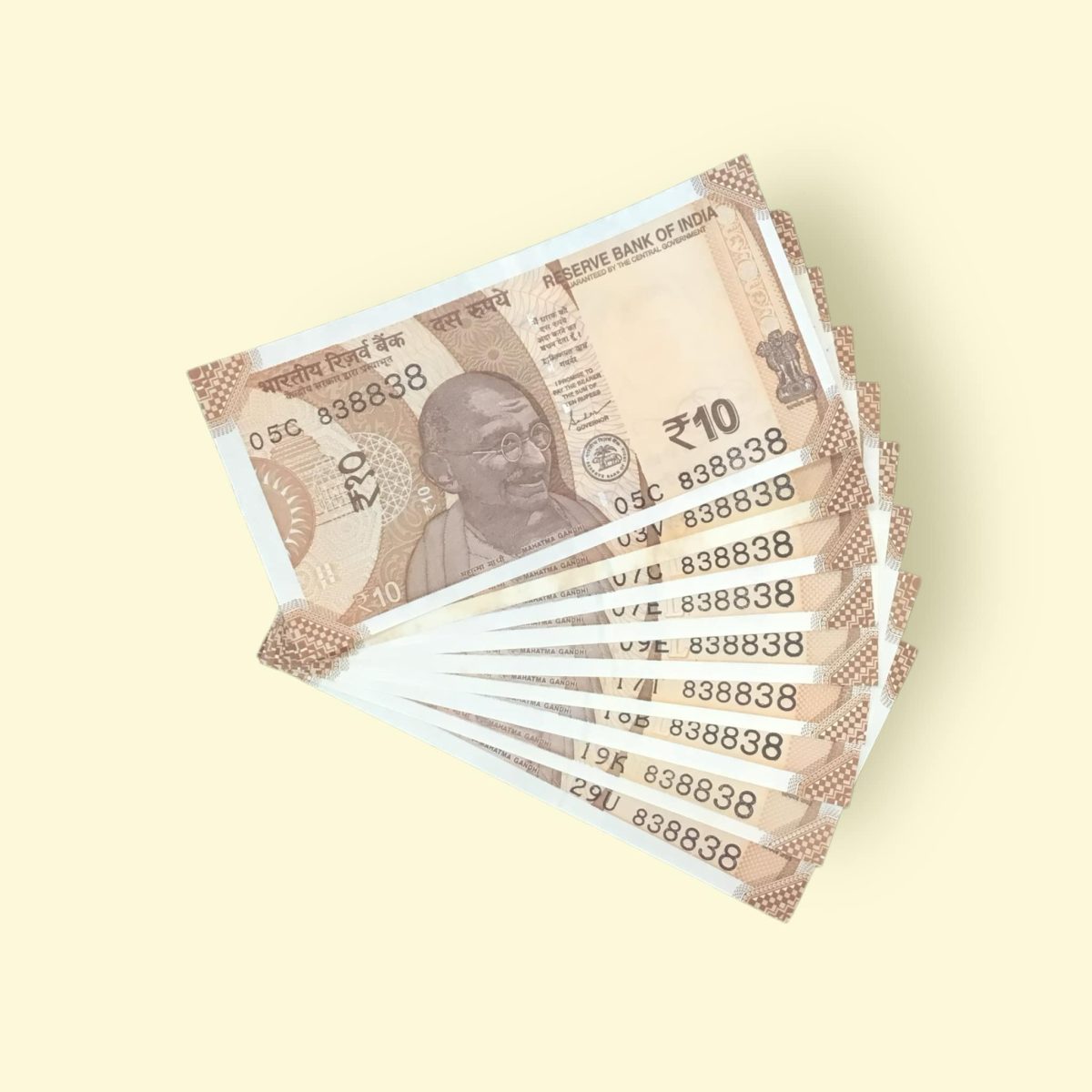 RS 10/- INDIA BANK NOTE 10 NOTE SAME NUMBER SET 838838 GEM UNC