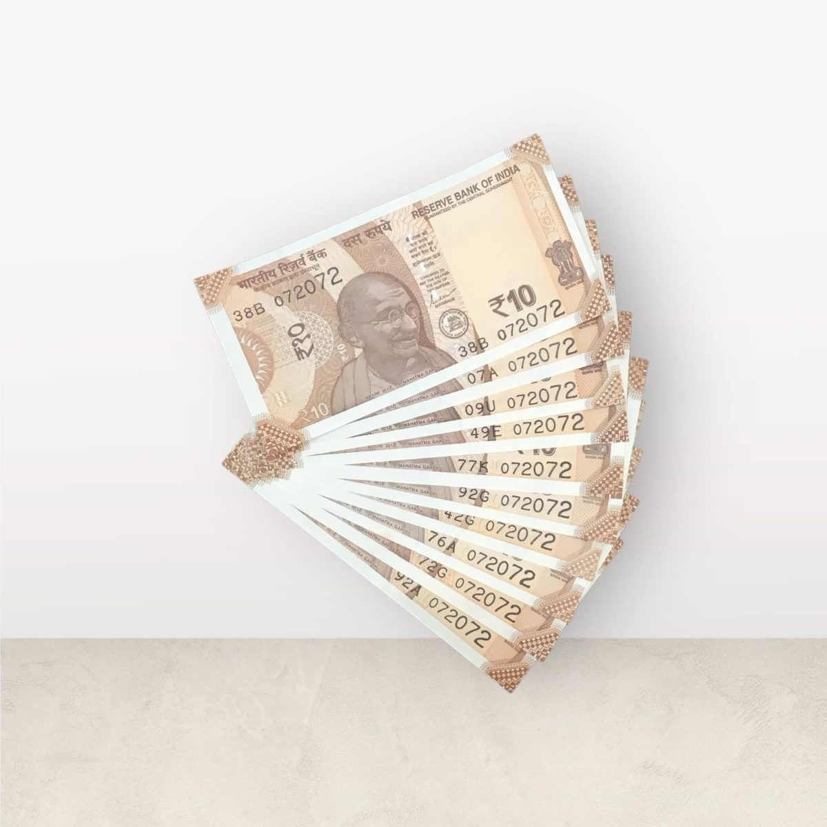 RS 10/- INDIA BANK NOTE SEMI FANCY 10 NOTE SAME NUMBER SET 072072 UNIQUE AND RARE