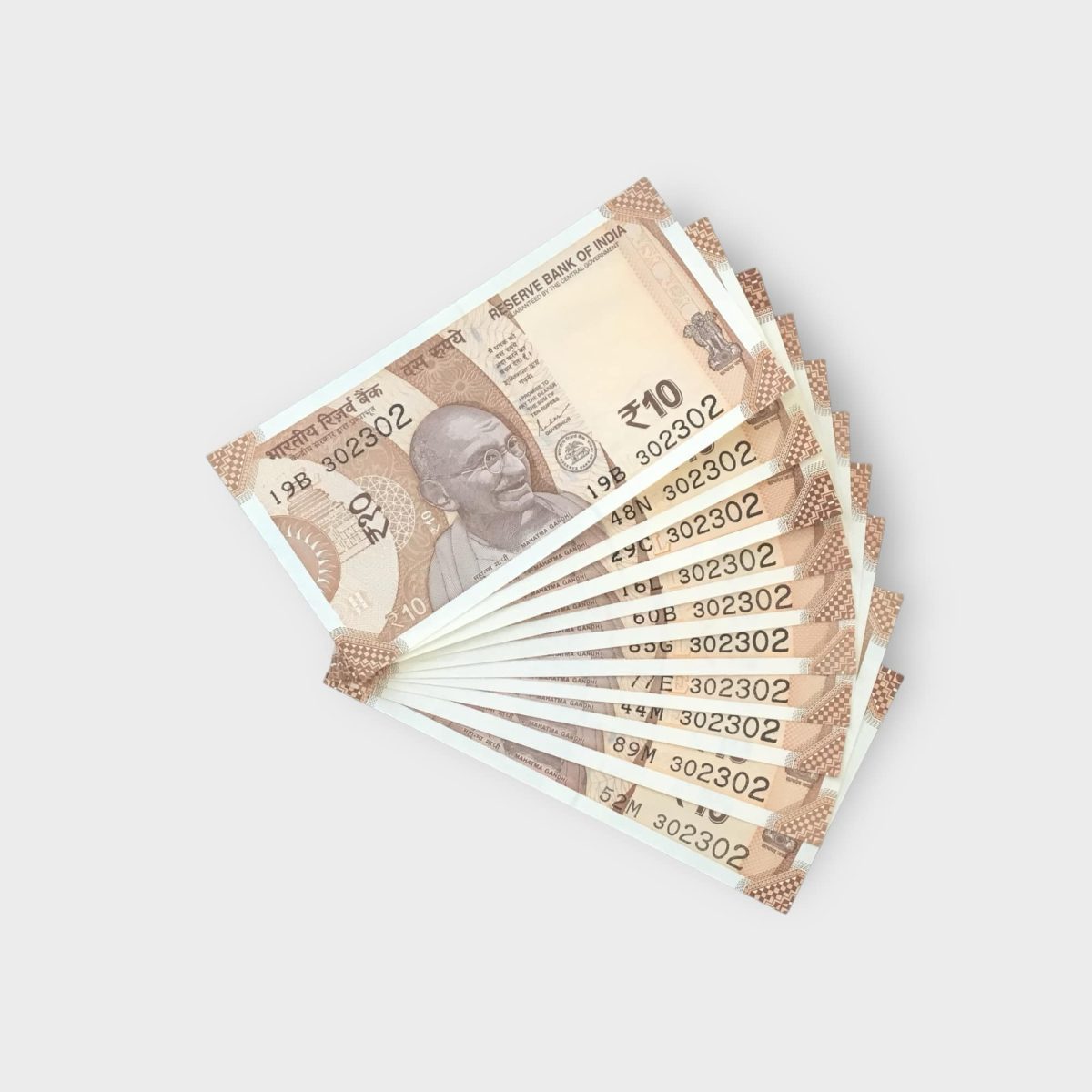 RS 10/- INDIA BANK NOTE SEMI FANCY 10 NOTE SAME NUMBER SET 302302 UNIQUE AND RARE
