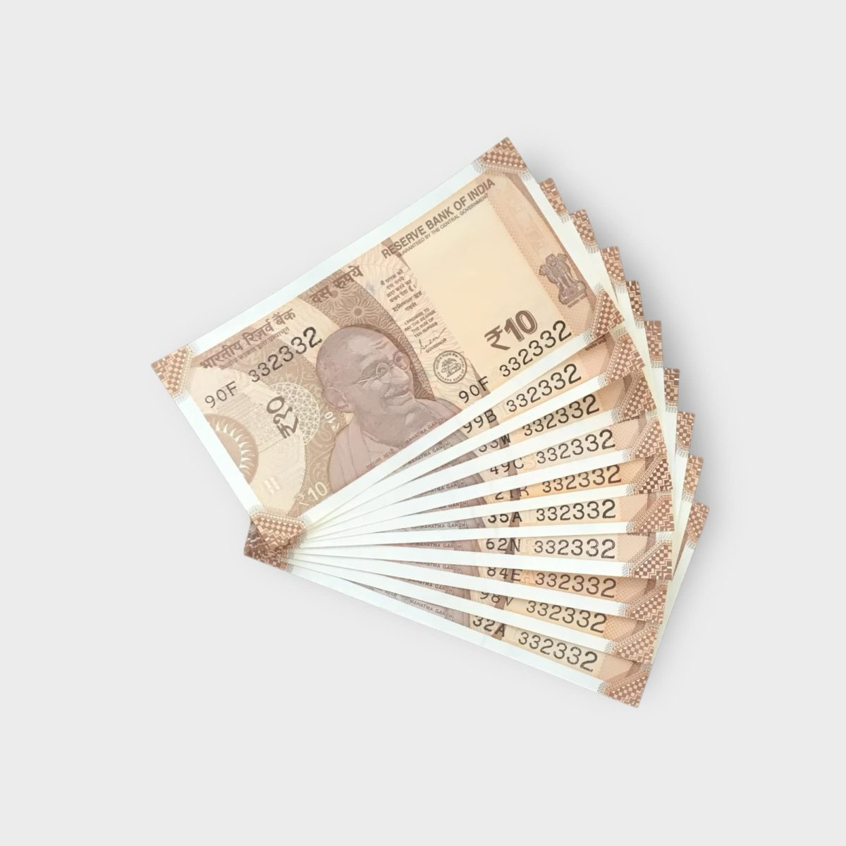RS 10/- INDIA BANK NOTE SEMI FANCY 10 NOTE SAME NUMBER SET 332332 UNIQUE AND RARE