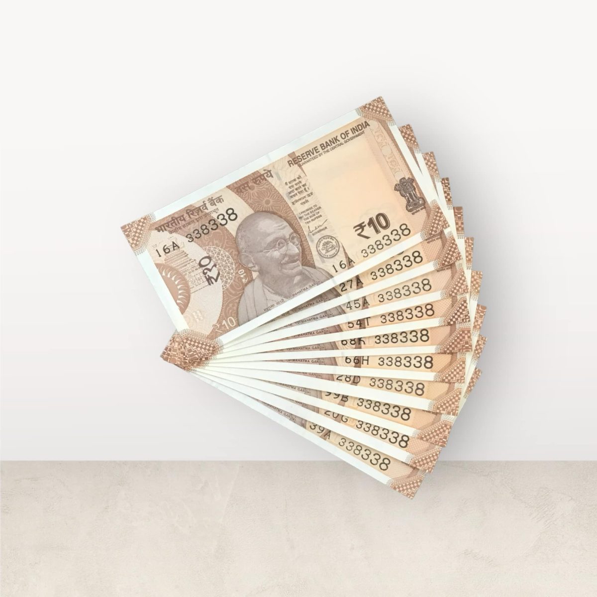 RS 10/- INDIA BANK NOTE SEMI FANCY 10 NOTE SAME NUMBER SET 338338 UNIQUE AND RARE