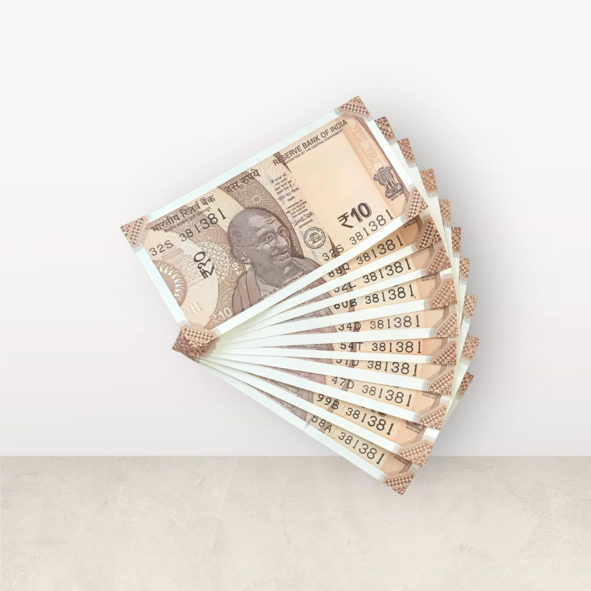 RS 10/- INDIA BANK NOTE SEMI FANCY 10 NOTE SAME NUMBER SET 381381 UNIQUE AND RARE