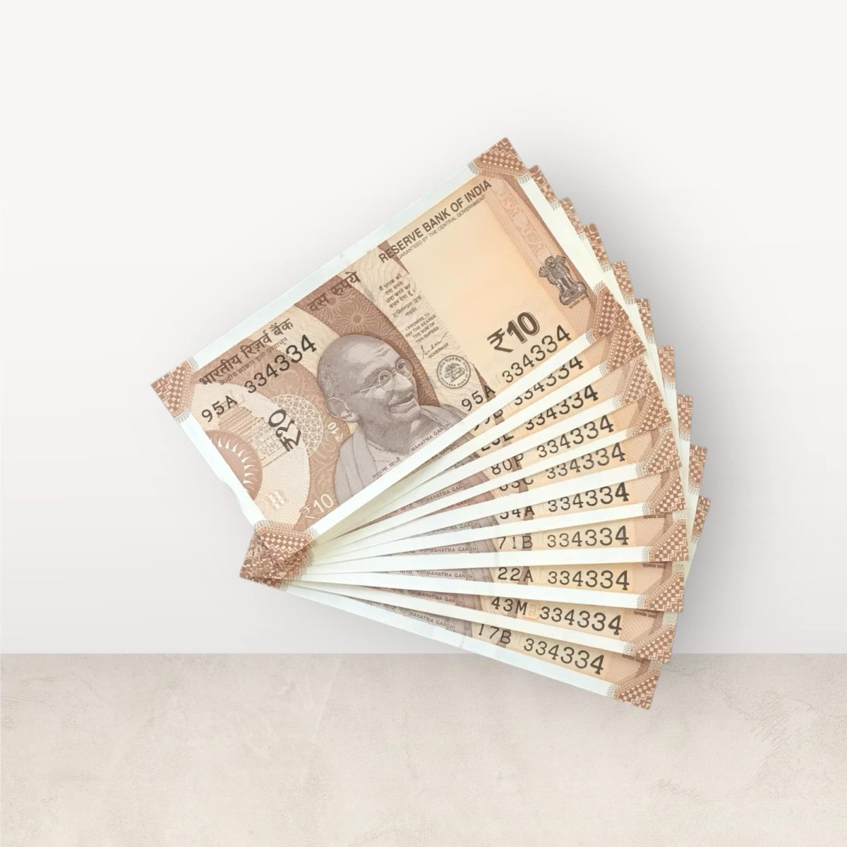 RS 10/- INDIA BANK NOTE SEMI FANCY 10 NOTE SAME NUMBER SET 334334 UNIQUE AND RARE