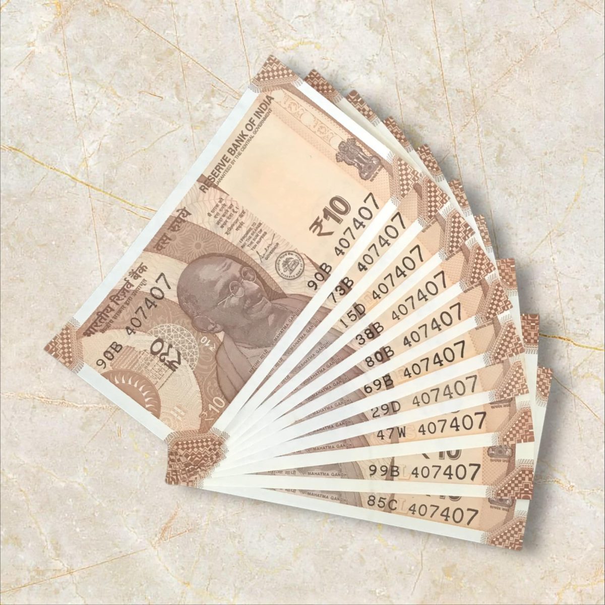 RS 10/- INDIA BANK NOTE SEMI FANCY 10 NOTE SAME NUMBER SET 407407 UNIQUE AND RARE