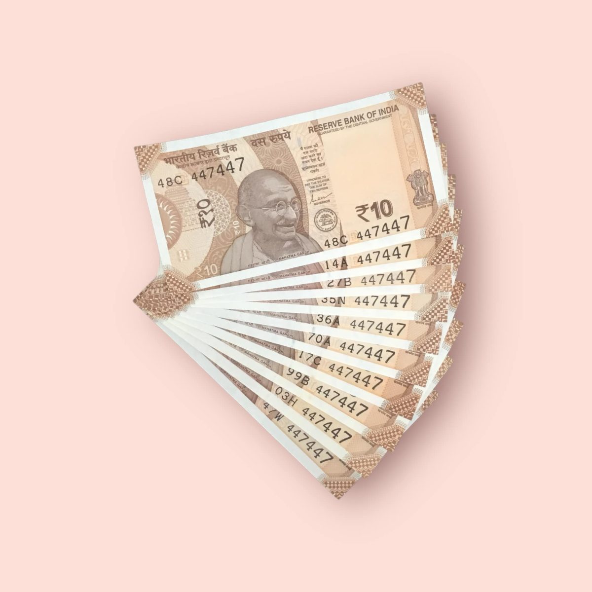 RS 10/- INDIA BANK NOTE SEMI FANCY 10 NOTE SAME NUMBER SET 447447 UNIQUE AND RARE