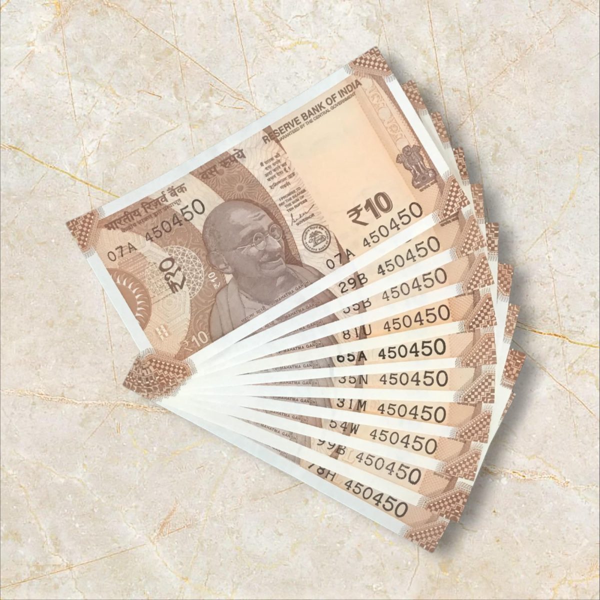 RS 10/- INDIA BANK NOTE SEMI FANCY 10 NOTE SAME NUMBER SET 450450 UNIQUE AND RARE