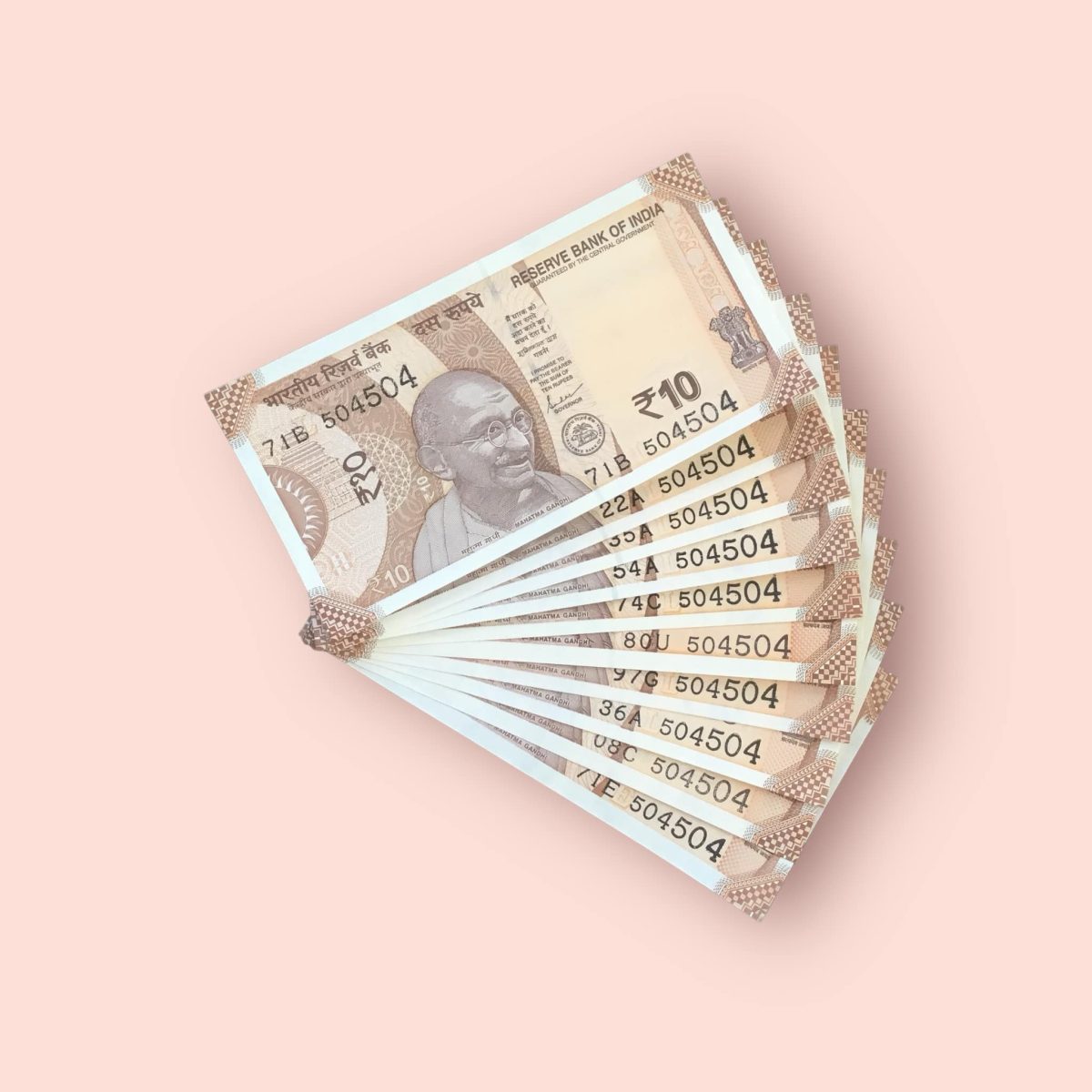 RS 10/- INDIA BANK NOTE SEMI FANCY 10 NOTE SAME NUMBER SET 504504 UNIQUE AND RARE