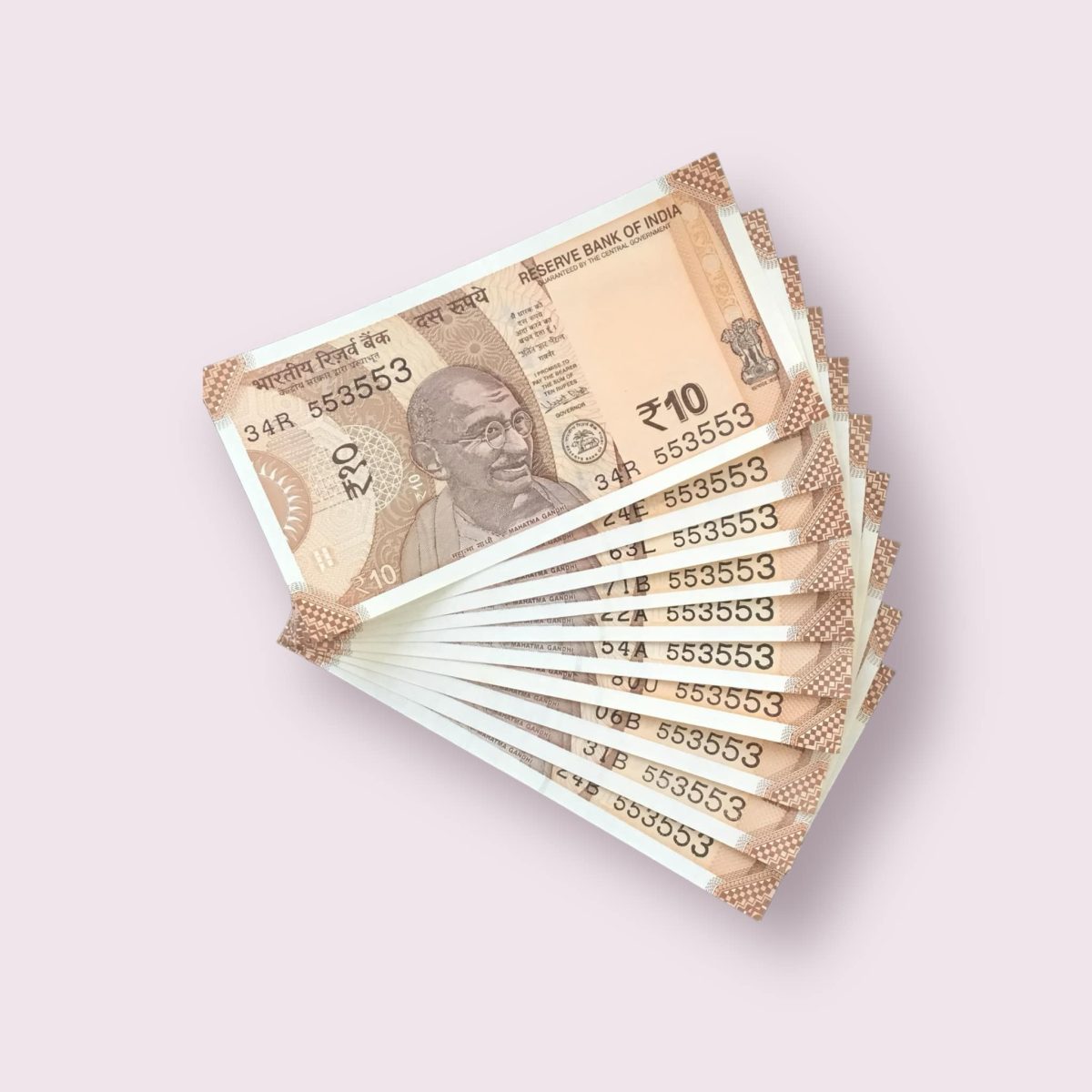 RS 10/- INDIA BANK NOTE SEMI FANCY 10 NOTE SAME NUMBER SET 553553 UNIQUE AND RARE