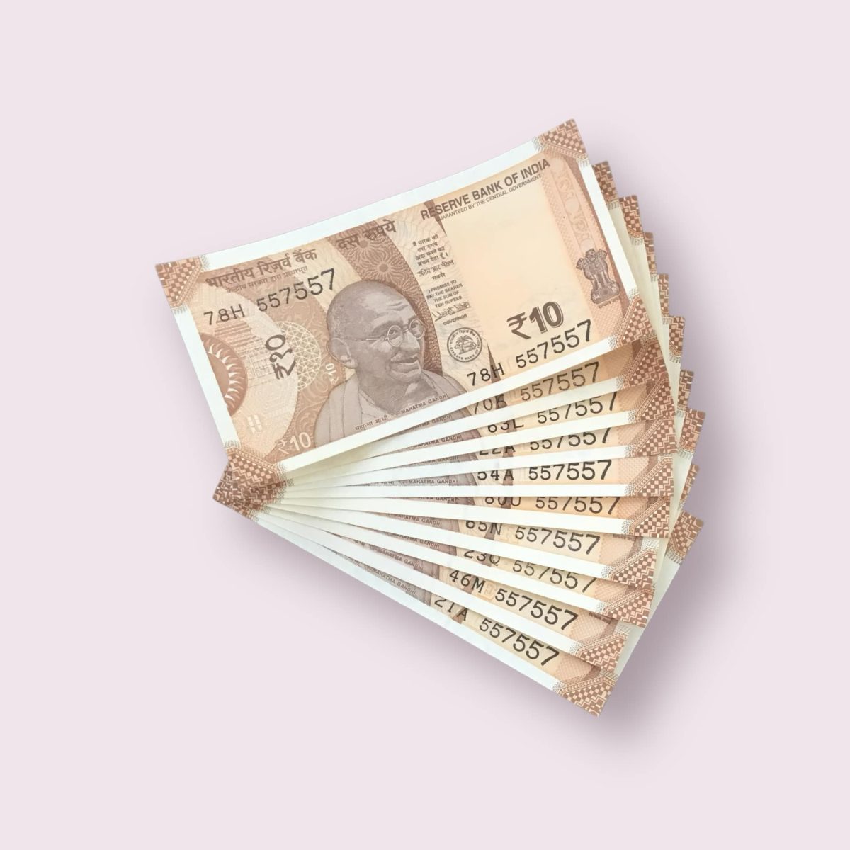 RS 10/- INDIA BANK NOTE SEMI FANCY 10 NOTE SAME NUMBER SET 557557 UNIQUE AND RARE