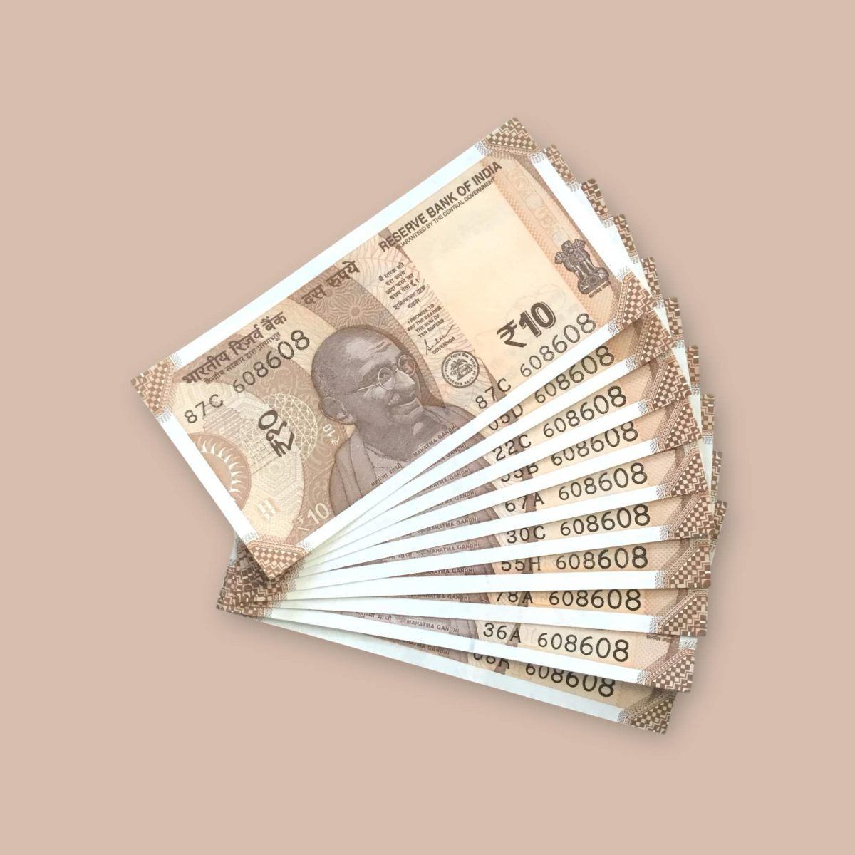 Delve into the rich history of Indian currency with this extraordinary collectible set of 10 Rupees banknotes. This semi-fancy 10-note set features the same unique serial number, 608608, making it a prized rarity for any enthusiast. Issued by the Reserve Bank of India, these banknotes hold a special place in the realm of numismatics. Dating back to a time when paper money was gaining prominence, these notes offer a glimpse into India’s economic evolution.