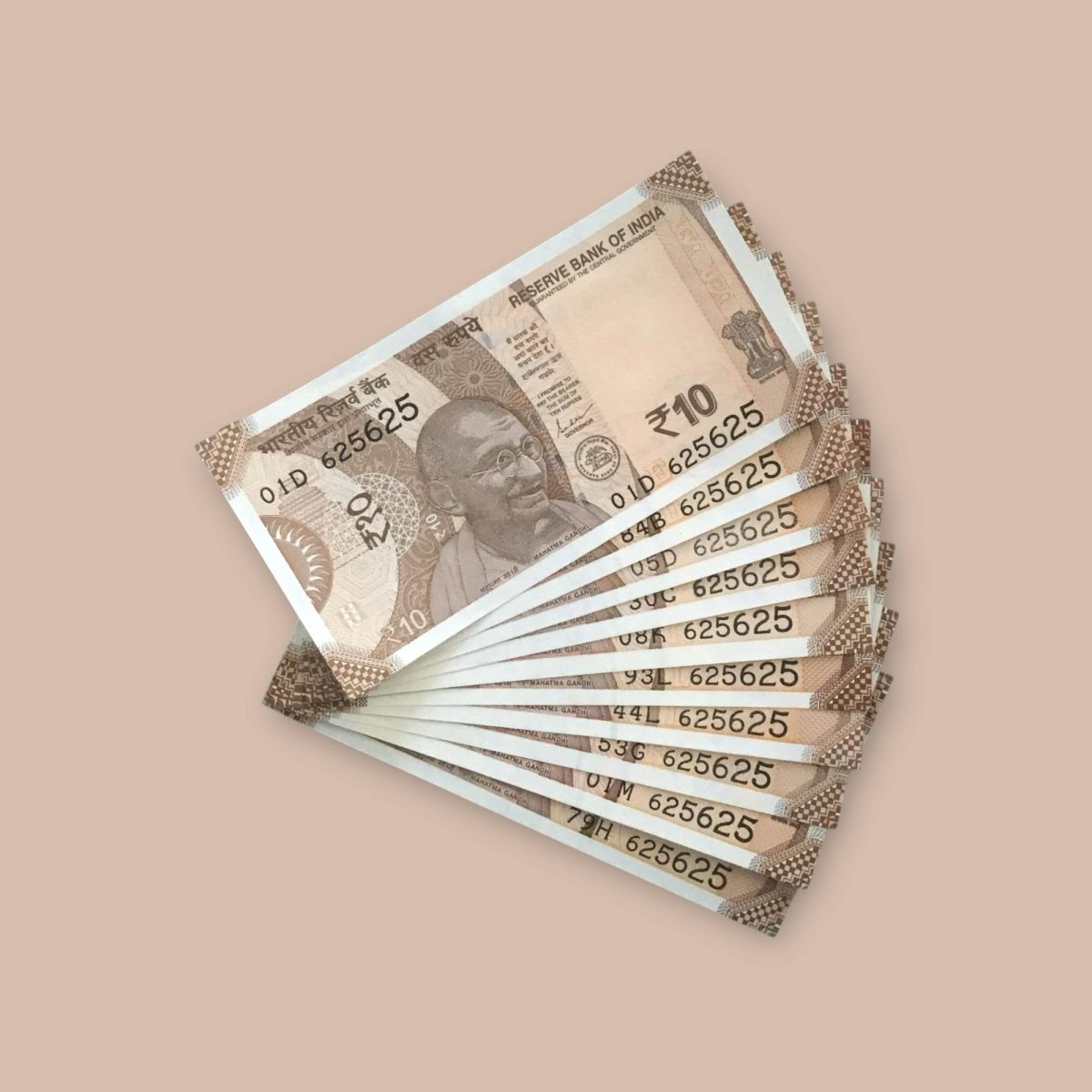 RS 10/- INDIA BANK NOTE SEMI FANCY 10 NOTE SAME NUMBER SET 625625 UNIQUE AND RARE