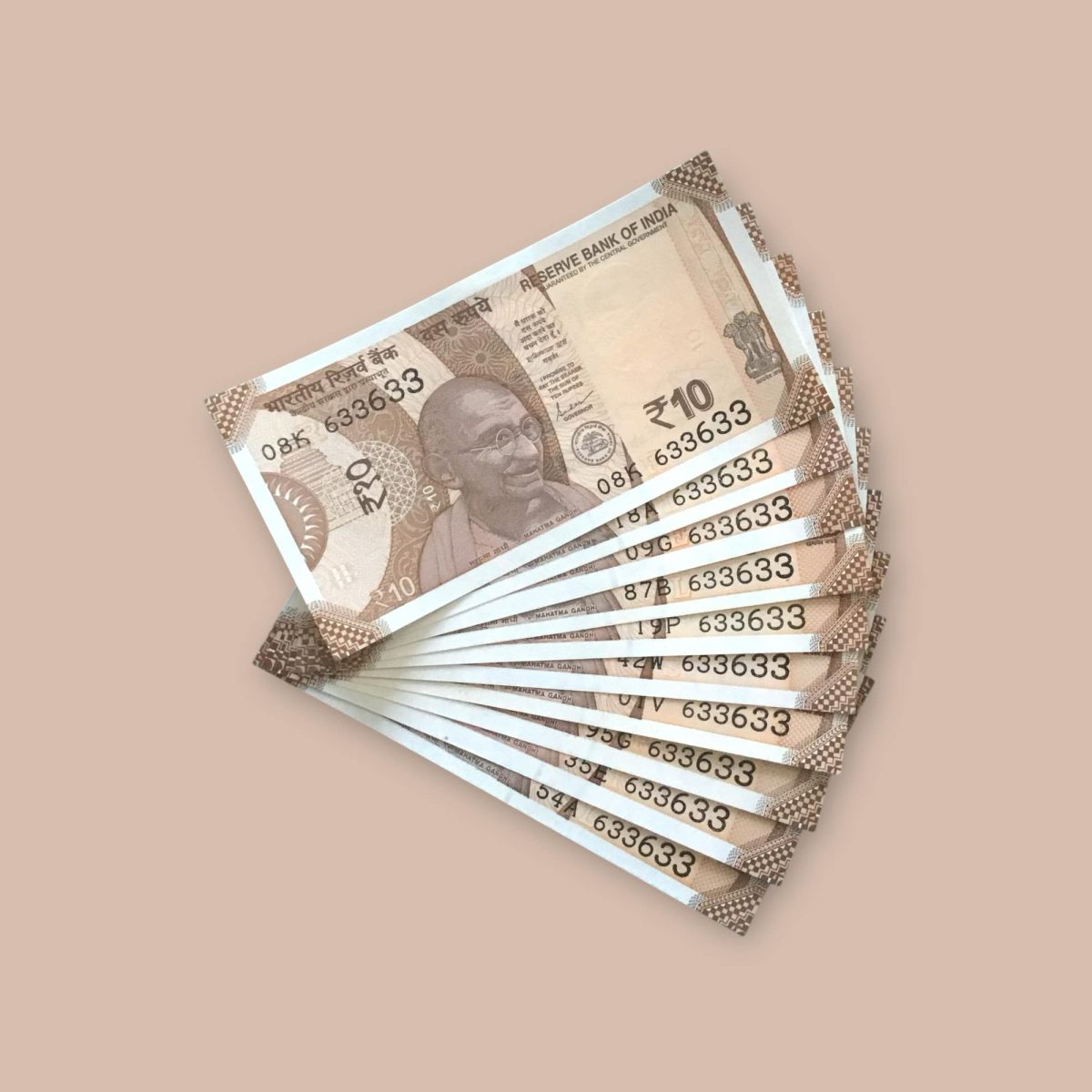 RS 10/- INDIA BANK NOTE SEMI FANCY 10 NOTE SAME NUMBER SET 633633 UNIQUE AND RARE