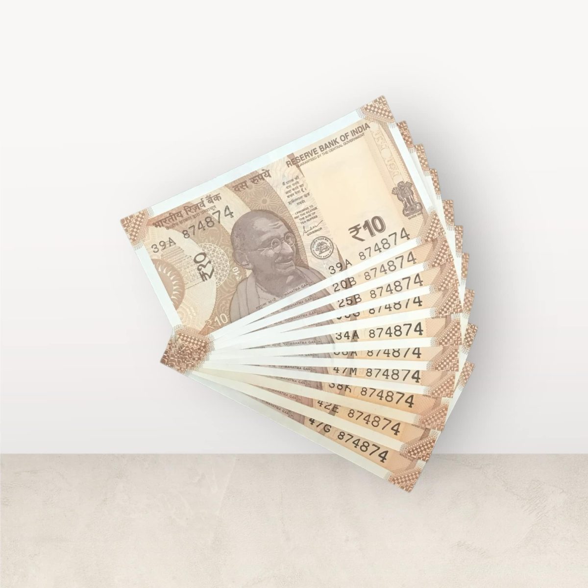 RS 10/- INDIA BANK NOTE SEMI FANCY 10 NOTE SAME NUMBER SET 874874 UNIQUE AND RARE