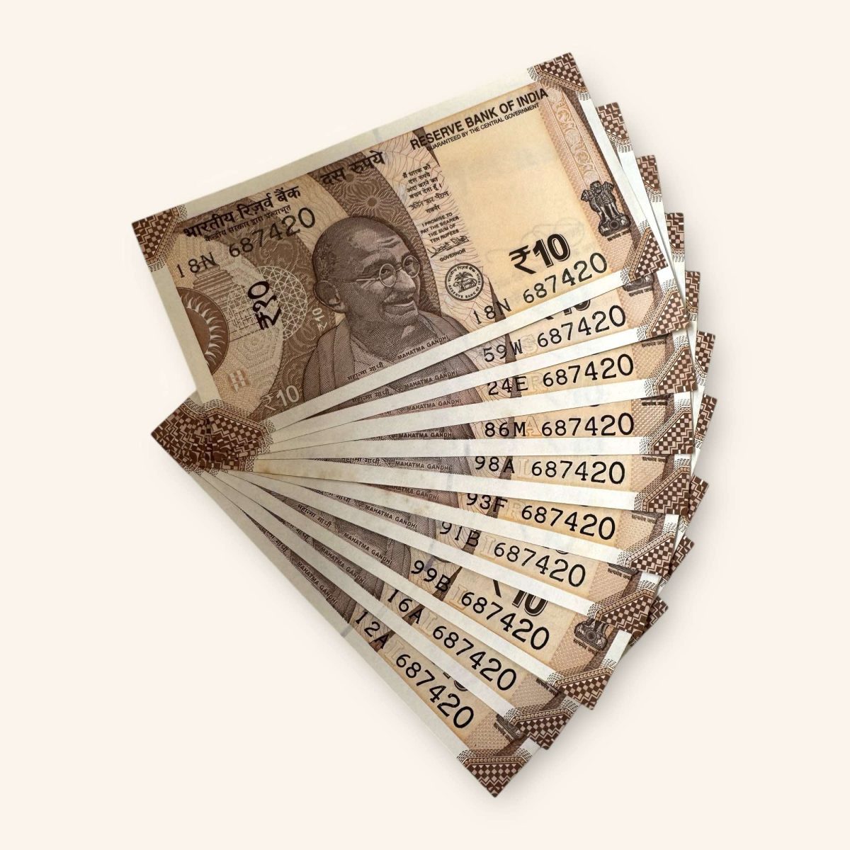 Indulge in the rich history of Indian currency with this fascinating Rs 10 India Banknote Holy Solid Number 687420 10 Note Set. Issued by the Reserve Bank of India, these UNC (NEW) banknotes are a gem of a find for collectors and enthusiasts alike. Dating back to a time when paper money was gaining prominence, these notes hold a piece of economic history in their design and significance.