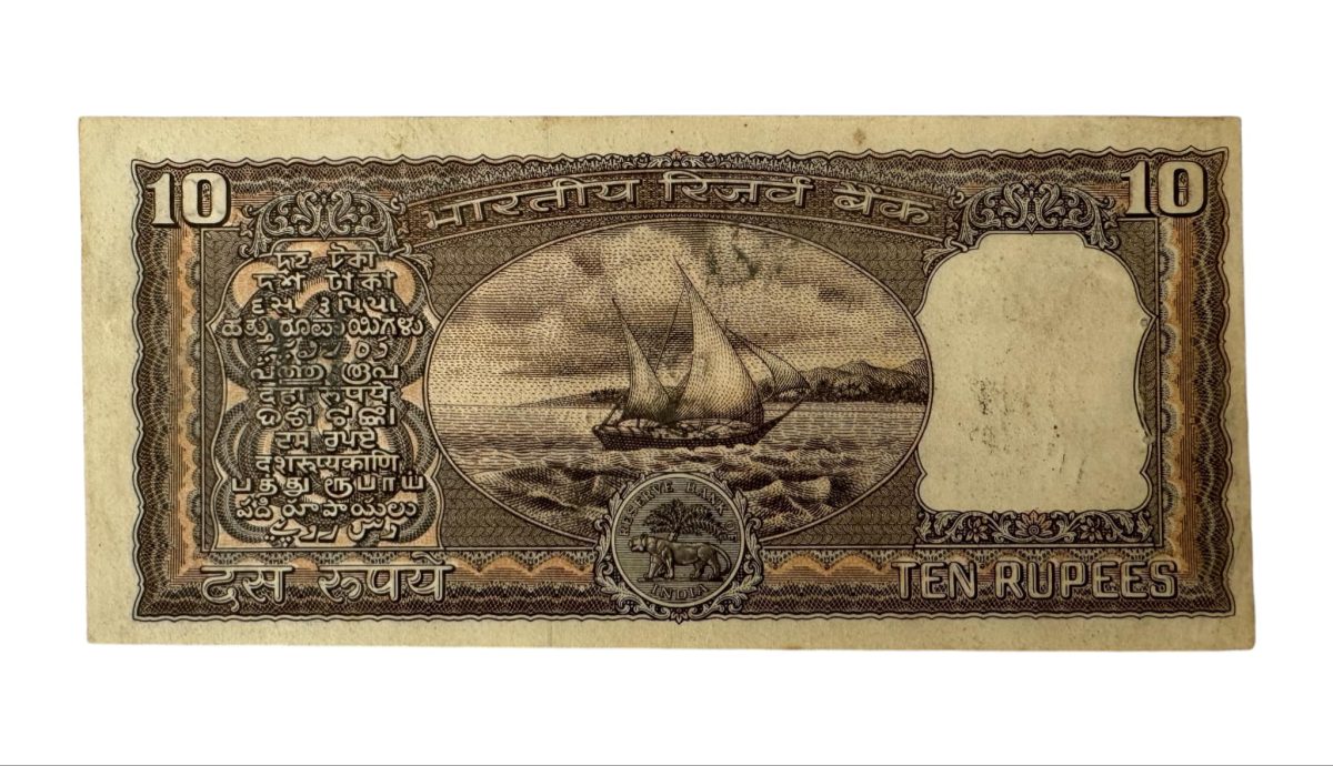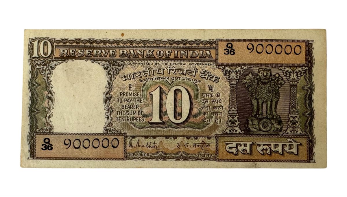 Rs 10 India Banknote Vintage Black Boat Issue Signed by R N Malhotra Fancy Number 900000 Unique and Rare