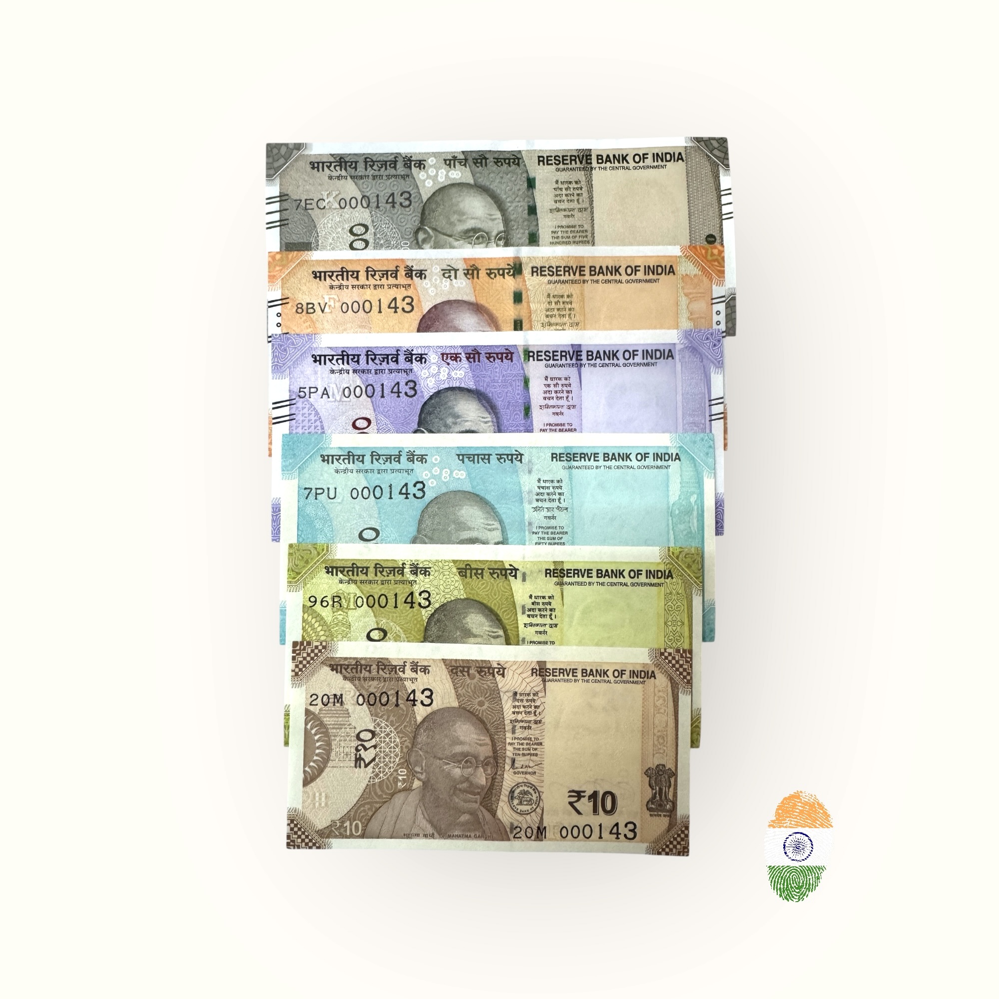 Rs 10 to 500 India Banknote Low Serial Number 000143 Issue Gem Unc Unique and Rare