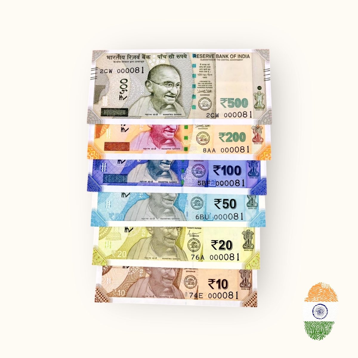 Rs 10 to 500 India Banknote Solid Fancy Set 000081 Gem Unc Unique Collection Rare