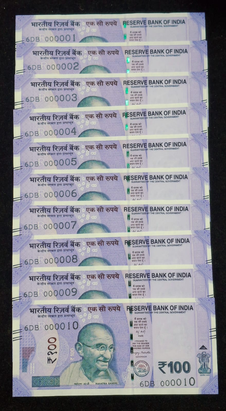 Rs 100 Bank note 10 pcs set Lower number 000001 to 000010 Gem UNC condition same prifix recieve
