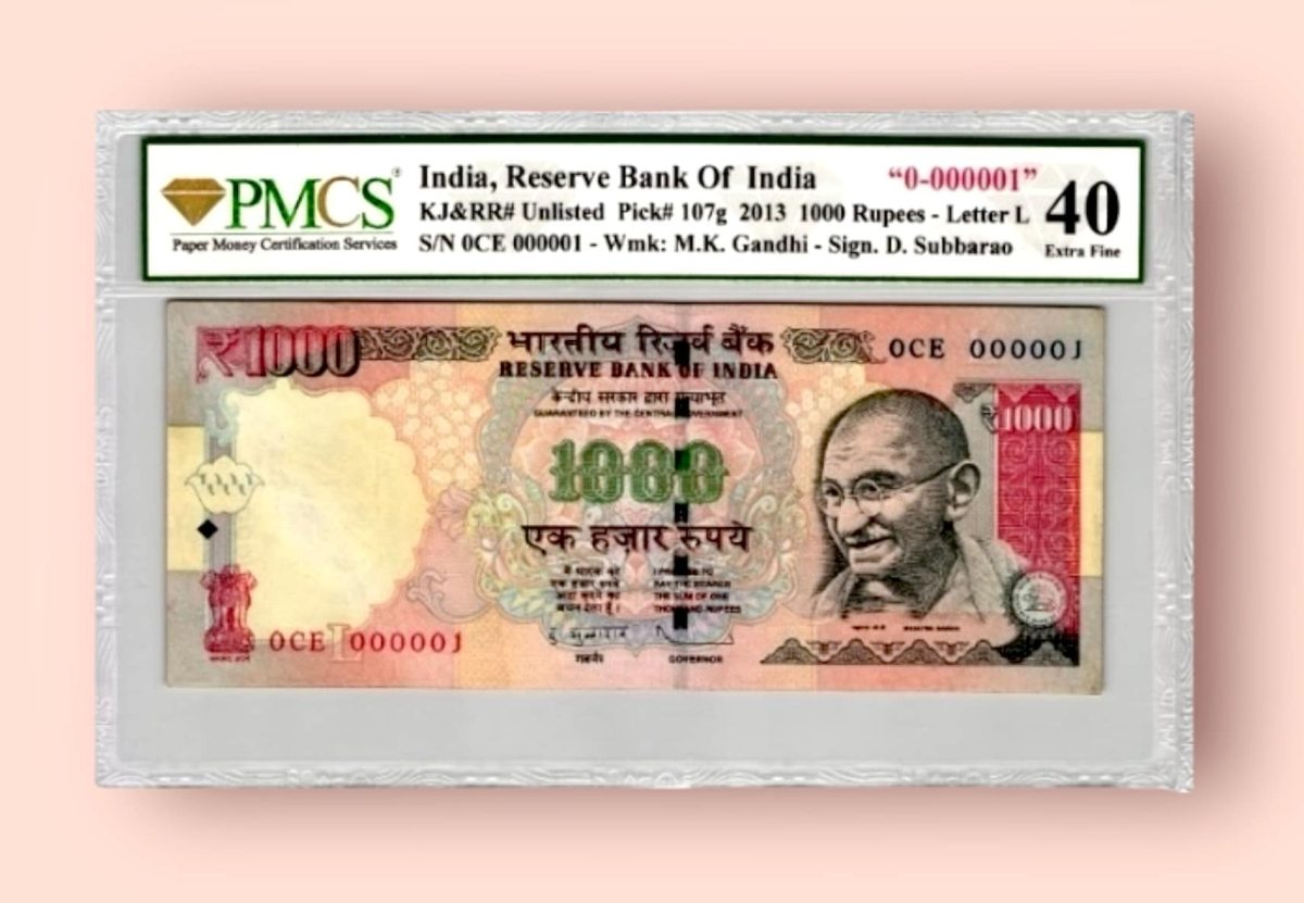 Immerse yourself in the rich history and allure of this rare and unique collectible – the Rs 1000 India Banknote from the year 2013. Graded with a low serial number of 000001, this banknote features the iconic Inset L and bears the distinguished signature of D Subharao. Issued by the Reserve Bank of India, this denomination holds not only monetary but also cultural significance. The banknote’s fancy number adds an extra layer of exclusivity to its appeal, making it a coveted piece for collectors worldwide. This piece encapsulates a slice of India’s economic narrative, making it a prized possession for enthusiasts seeking to own a tangible piece of the country’s financial history. With its unique attributes and exceptional rarity, this banknote is not just a piece of paper but a testament to craftsmanship, heritage, and investment potential. Its pristine condition and certified authenticity further enhance its value, promising a valuable addition to any collector’s treasury.