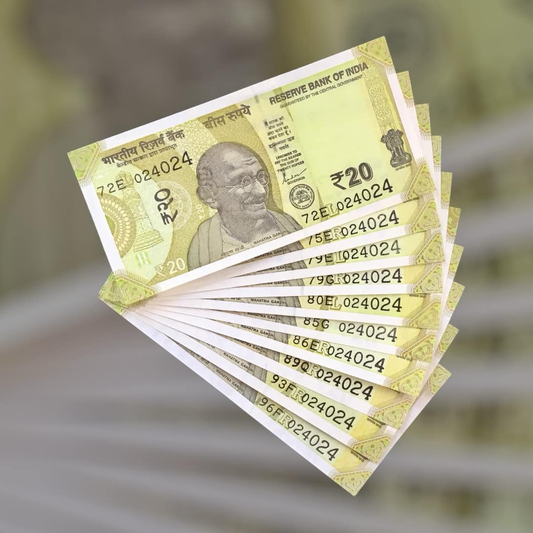 RS 20 INDIA BANK NOTE SEMI FANCY 10 NOTE SAME NUMBER SETS 024024 UNIQUE AND RARE