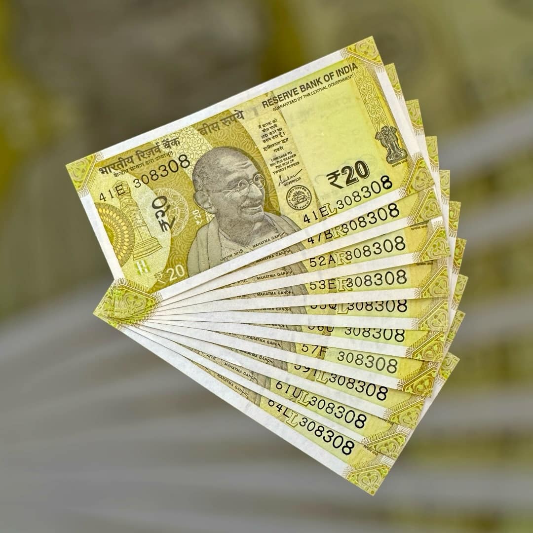 RS 20 INDIA BANK NOTE SEMI FANCY 10 NOTE SAME NUMBER SETS 308308 UNIQUE AND RARE