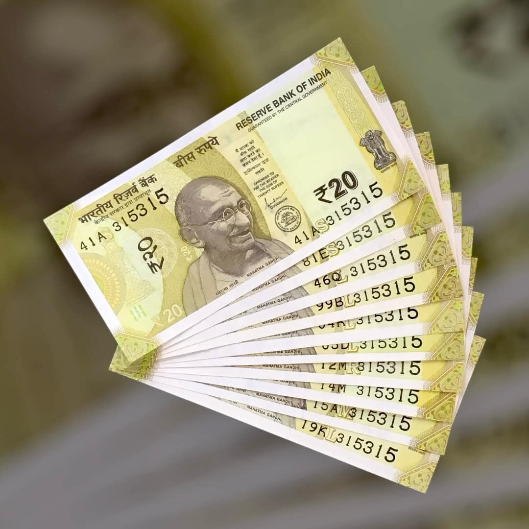RS 20 INDIA BANK NOTE SEMI FANCY 10 NOTE SAME NUMBER SETS 315315 UNIQUE AND RARE