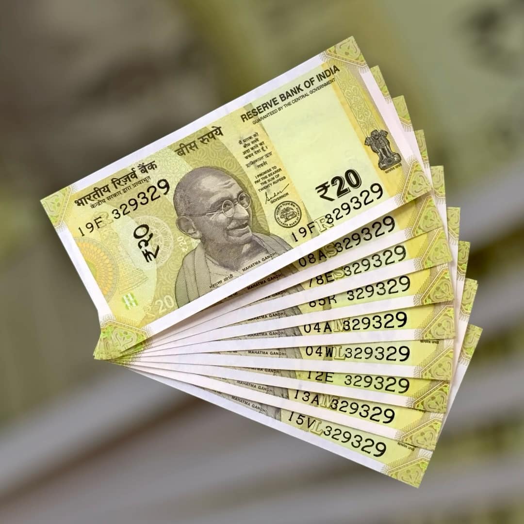 RS 20 INDIA BANK NOTE SEMI FANCY 10 NOTE SAME NUMBER SETS 329329 UNIQUE AND RARE