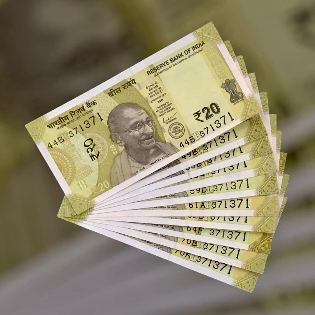 RS 20 INDIA BANK NOTE SEMI FANCY 10 NOTE SAME NUMBER SETS 371371 UNIQUE AND RARE