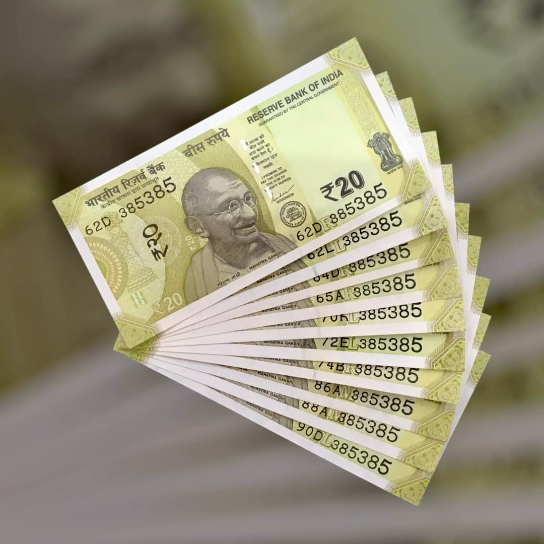 RS 20 INDIA BANK NOTE SEMI FANCY 10 NOTE SAME NUMBER SETS 385385 UNIQUE AND RARE
