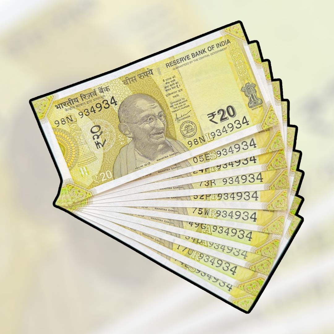 ✅ Rare set of 10 India 20 Rupee banknotes with the same serial number 934934