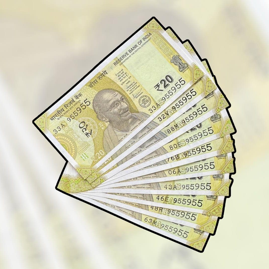 RS 20 INDIA BANK NOTE SEMI FANCY 10 NOTE SAME NUMBER SETS 955955 UNIQUE AND RARE