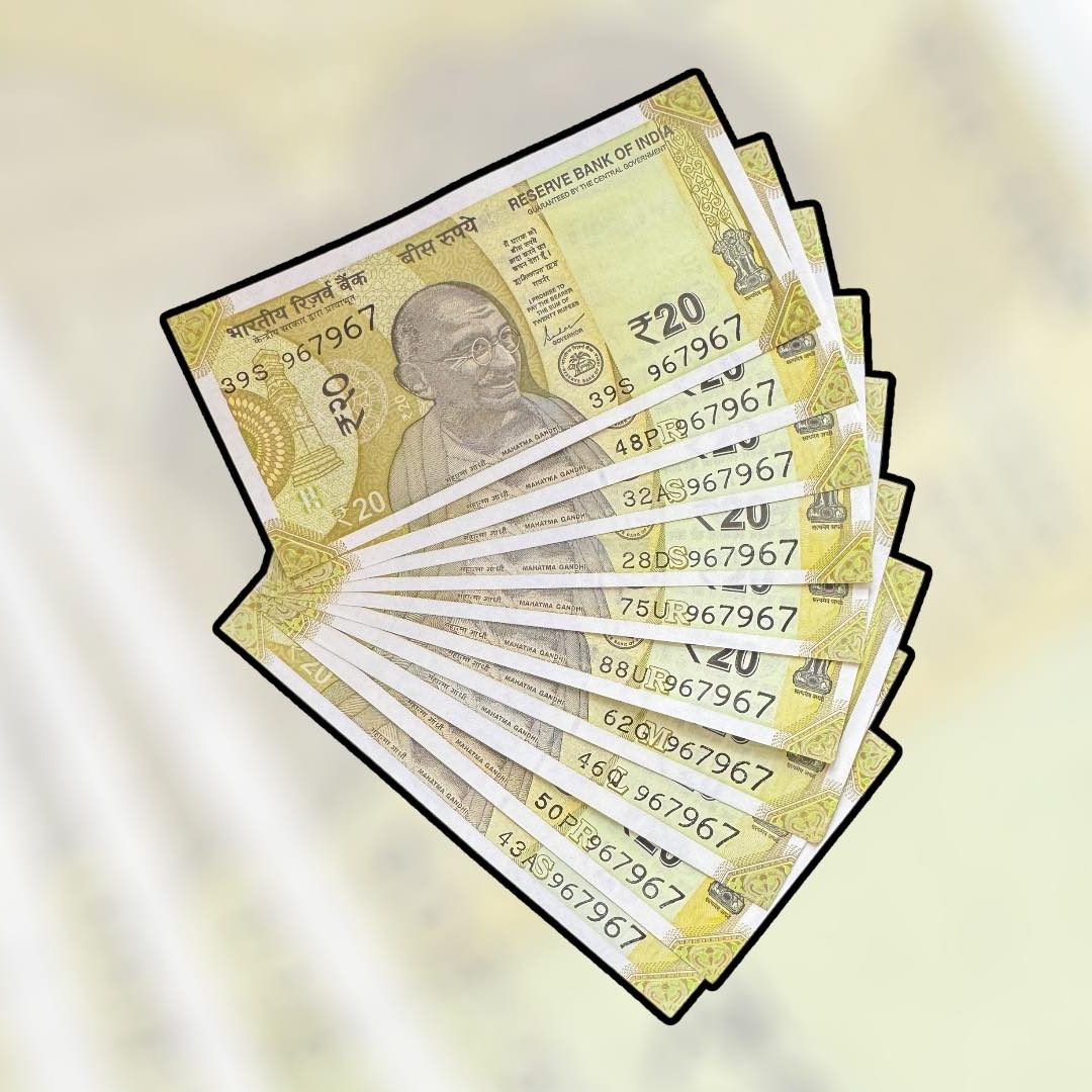 RS 20 INDIA BANK NOTE SEMI FANCY 10 NOTE SAME NUMBER SETS 967967 UNIQUE AND RARE