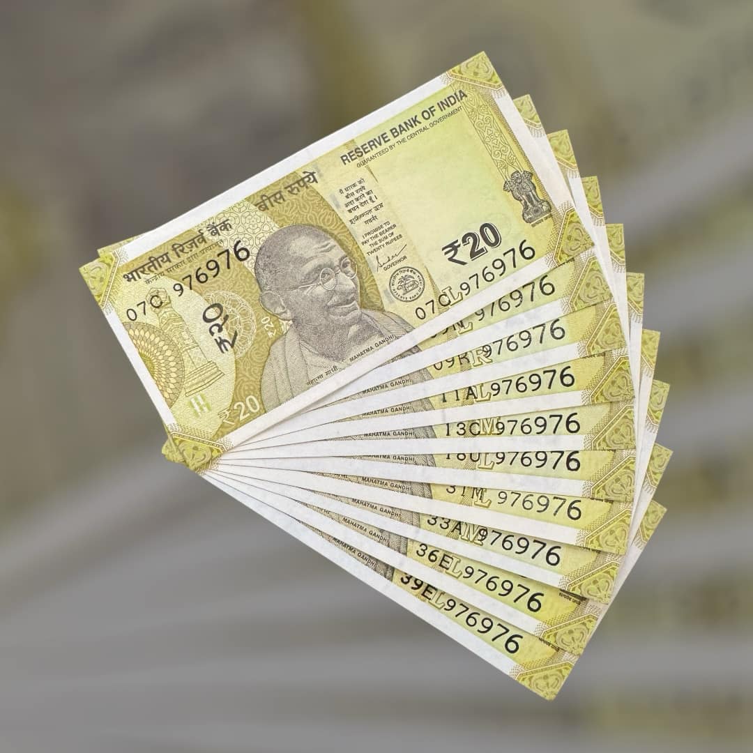 RS 20 INDIA BANK NOTE SEMI FANCY 10 NOTE SAME NUMBER SETS 976976 UNIQUE AND RARE
