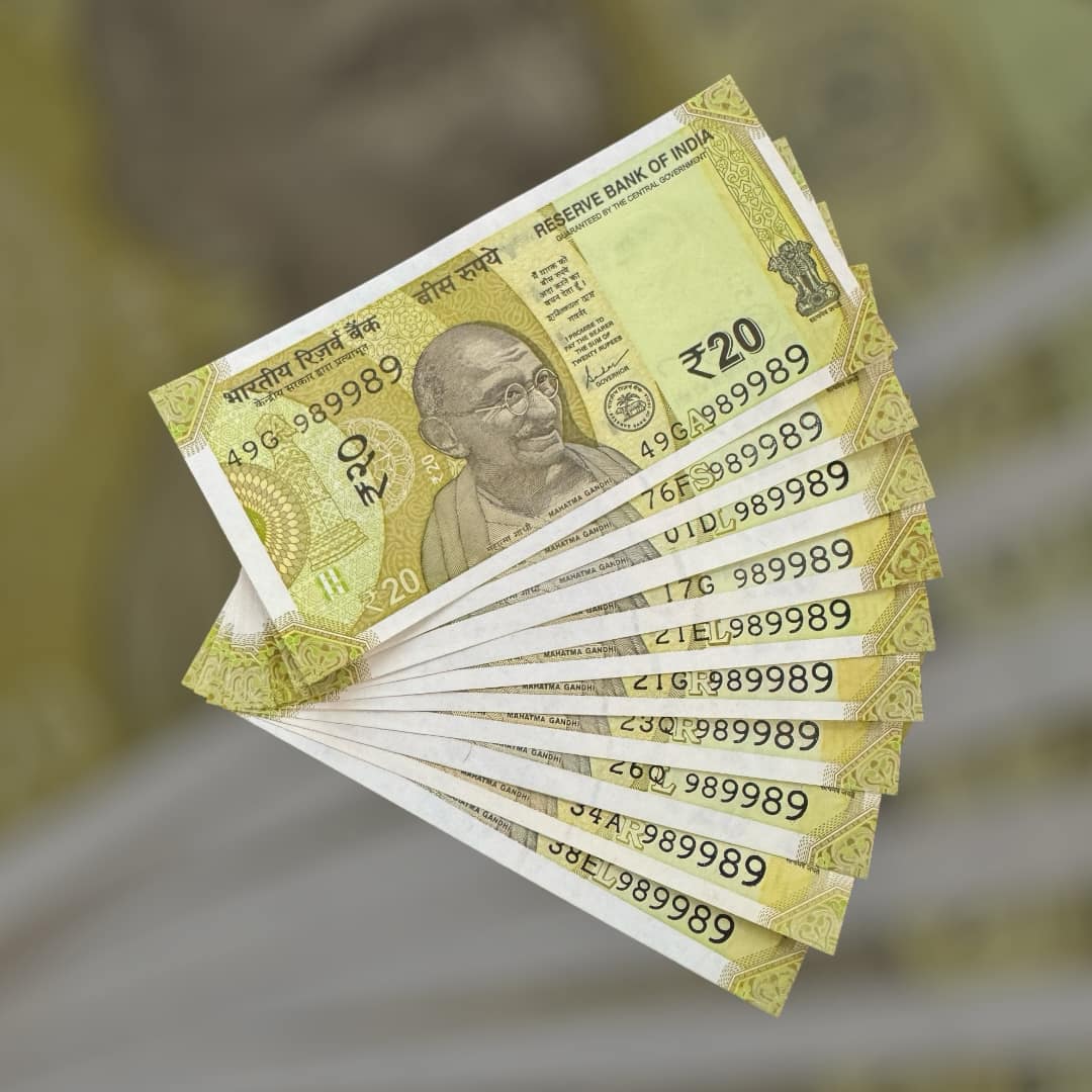 RS 20 INDIA BANK NOTE SEMI FANCY 10 NOTE SAME NUMBER SETS 989989 UNIQUE AND RARE