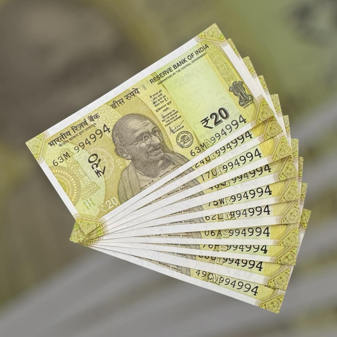 RS 20 INDIA BANK NOTE SEMI FANCY 10 NOTE SAME NUMBER SETS 994994 UNIQUE AND RARE