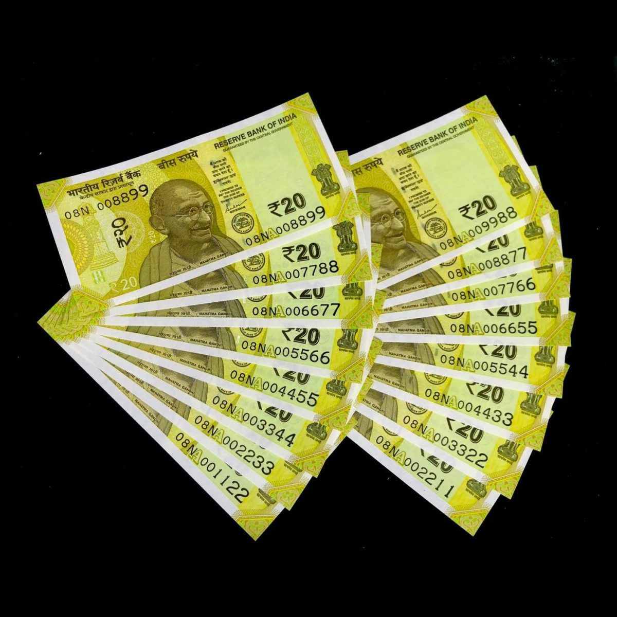 Rs 20 India Banknote Fancy Number 001122 to 009988 Gem UNC Set Same Prefix Unique