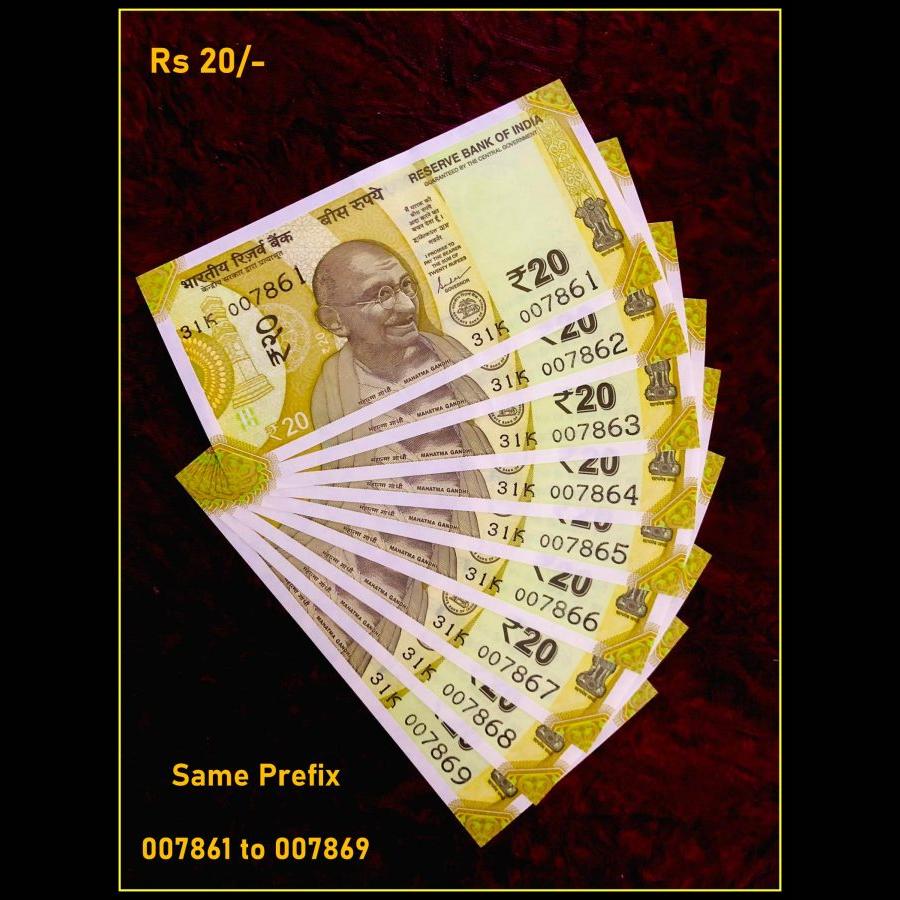 Rs 20 INDIA BANKNOTE Fancy Number 007861 to 007869 Gem UNC Set Same Prefix Unique