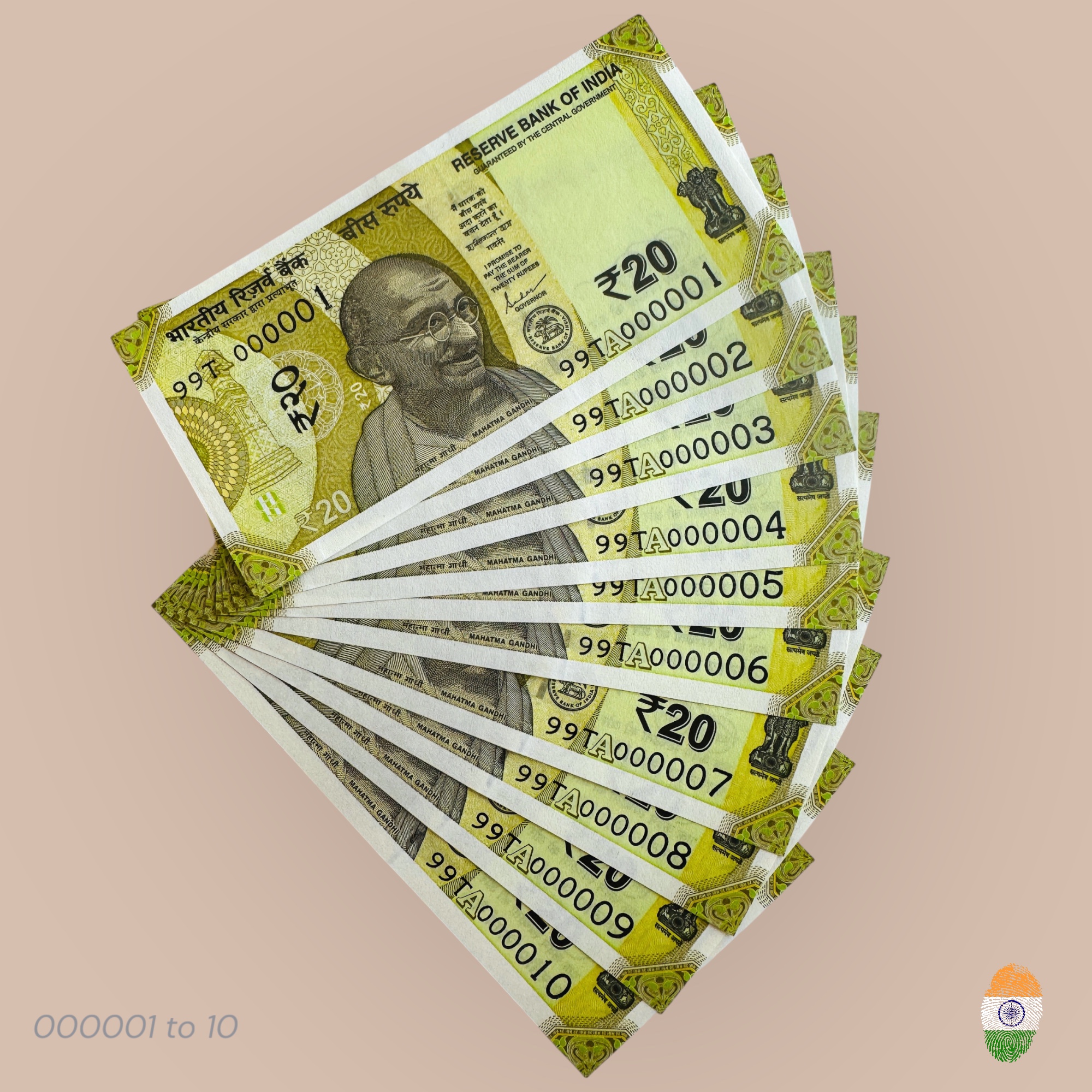 Rs 20 India Banknote Fancy Number Set 000001 to 000010 Prefix 99 Unique and Rare
