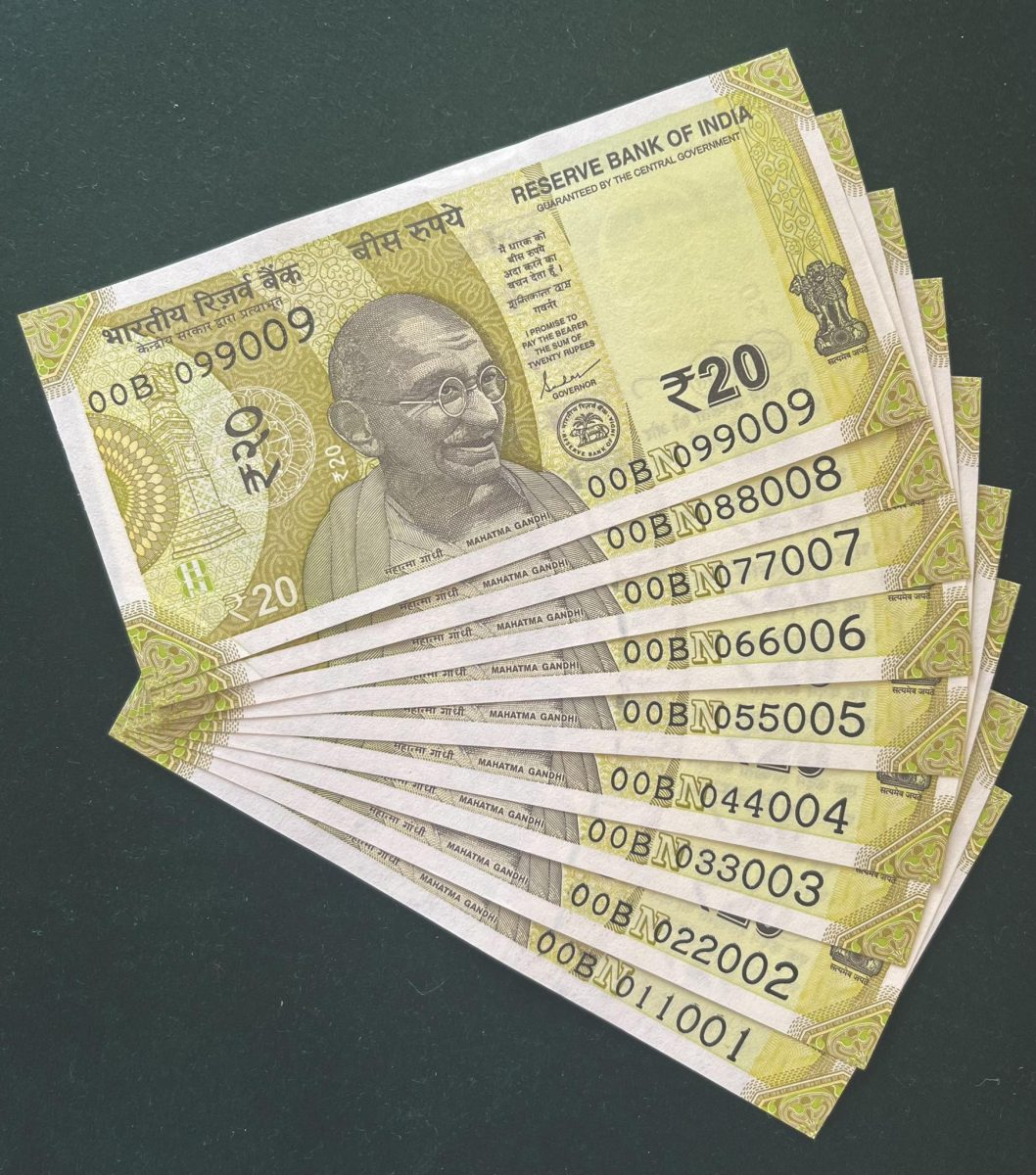 Rs 20/- India Banknote Semi Solid Set 00 Same Prefix 099009 To 011001 Gem Unc Unique and Rare