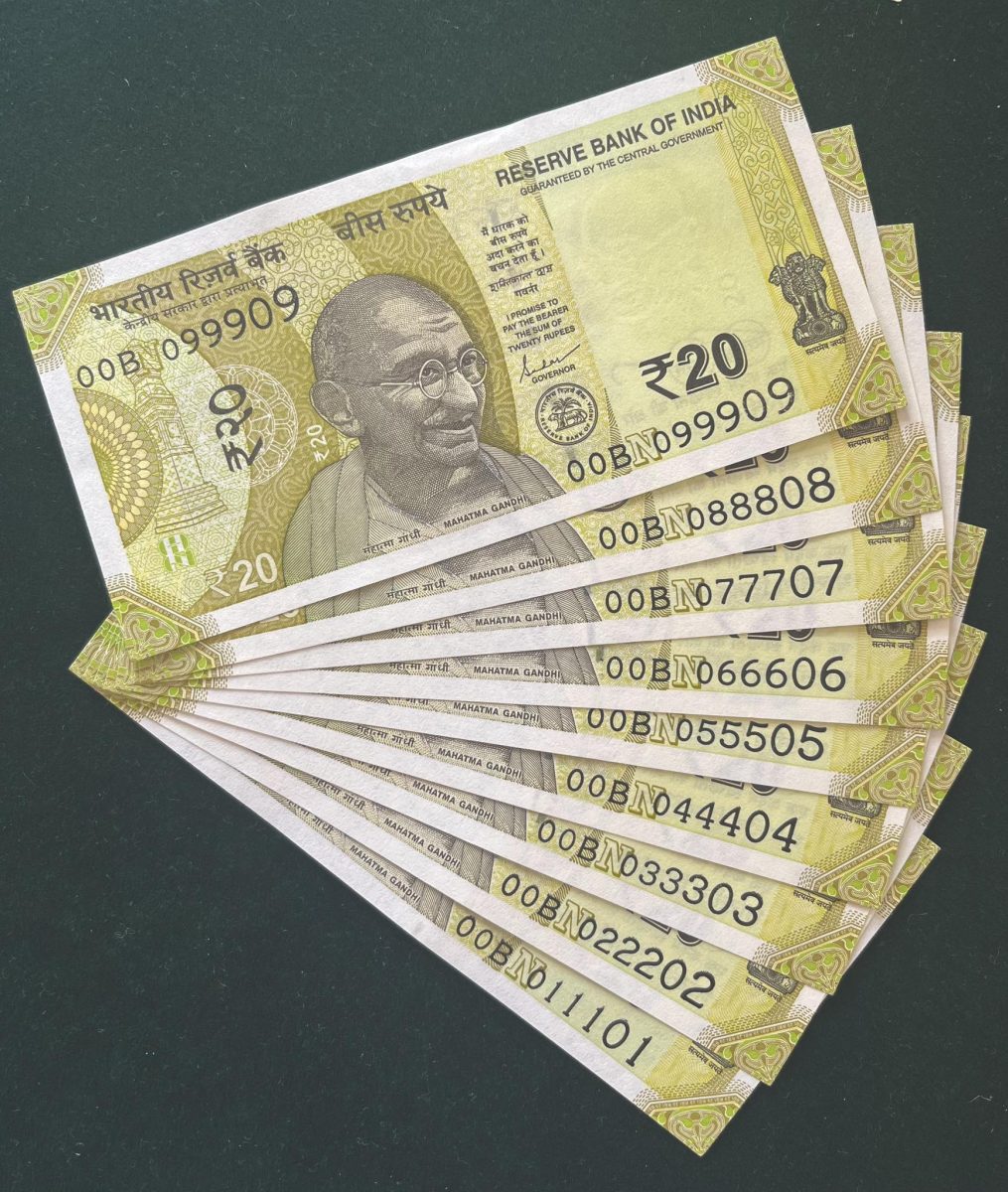 Rs 20/- India Banknote Semi Solid Set 00 Same Prefix 099909 To 011101 Gem Unc Unique and Rare
