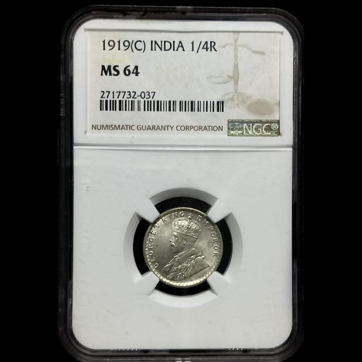 Discover a numismatic gem with this exceptionally rare MS 64 1/4 Rupee coin from India, minted in 1919 and professionally graded by NGC. This stunning collectible showcases intricate details and sharp strikes, embodying the craftsmanship of a bygone era under British rule. The coin’s brilliant uncirculated condition and NGC certification attest to its authenticity and superior quality.