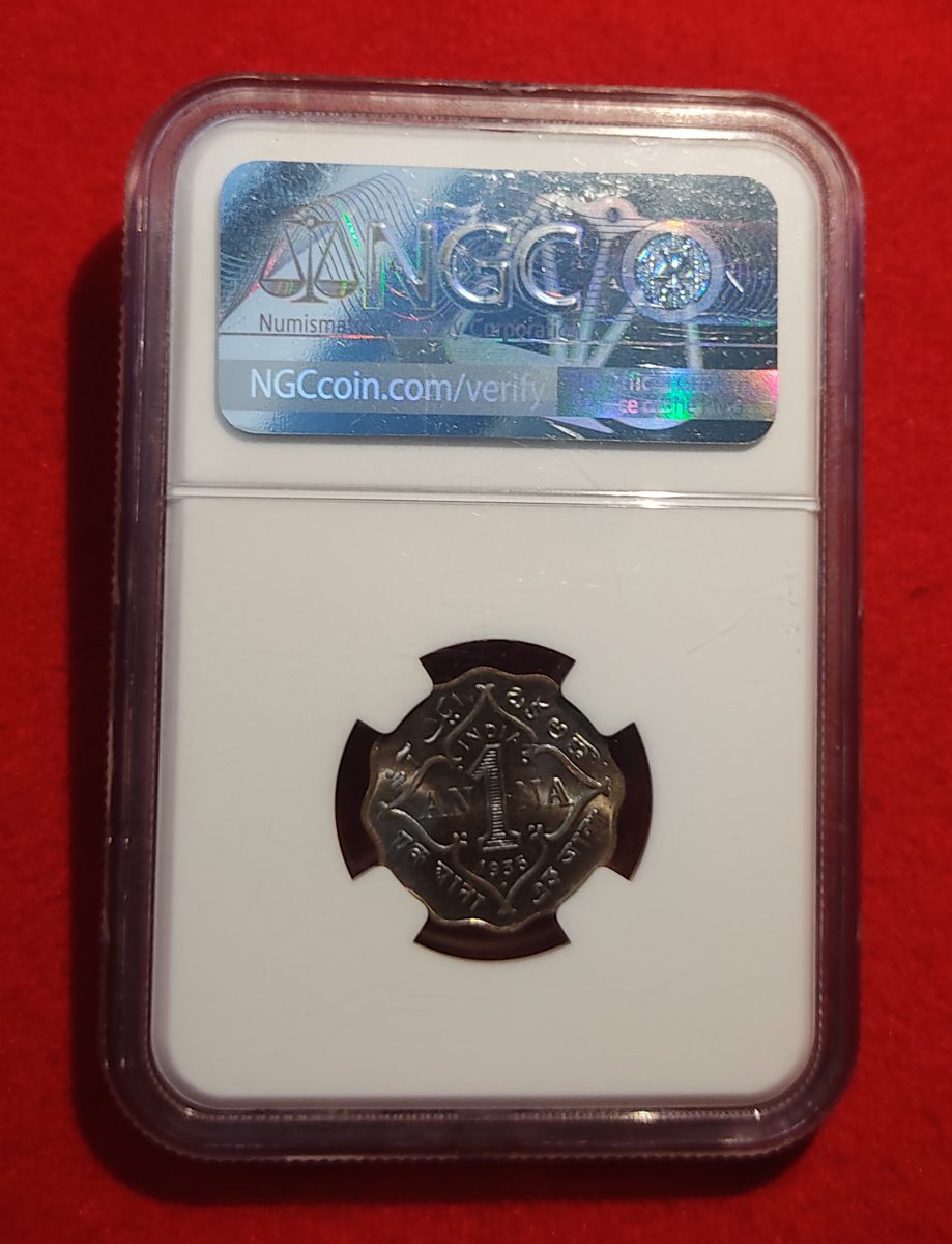 With its intricate design and flawless preservation, this ONE ANNA coin is a prized possession for collectors seeking rare and high-grade numismatic treasures. The Bombay Mint’s stamp adds a touch of authenticity and rarity to this piece, making it a coveted addition to any collection. Certified by NGC, this coin ensures its quality and value, making it a valuable investment for numismatists and history enthusiasts alike. Whether you are a seasoned collector or a novice in the world of numismatics, this George V coin is a must-have for its historical significance, impeccable grade, and exquisite craftsmanship.