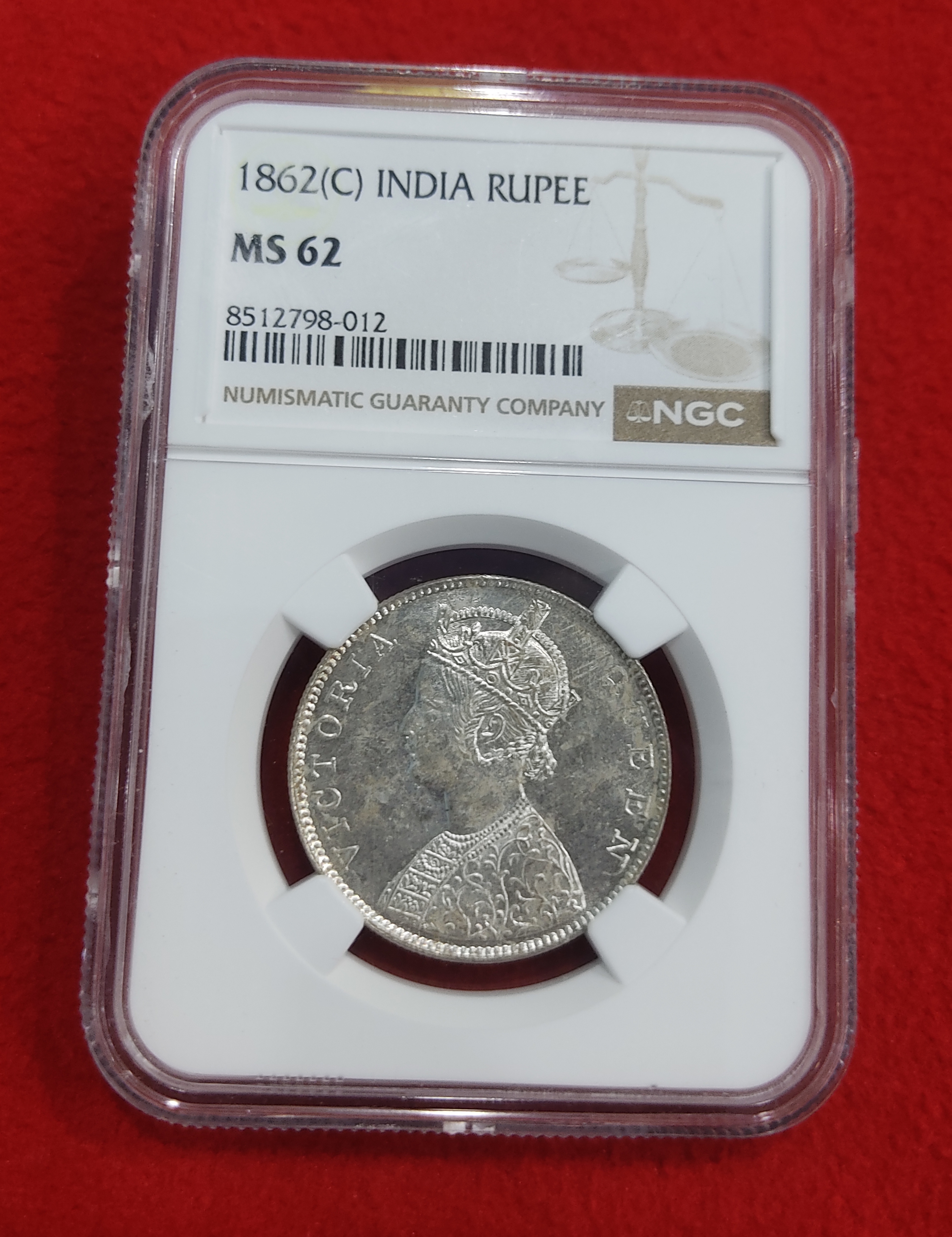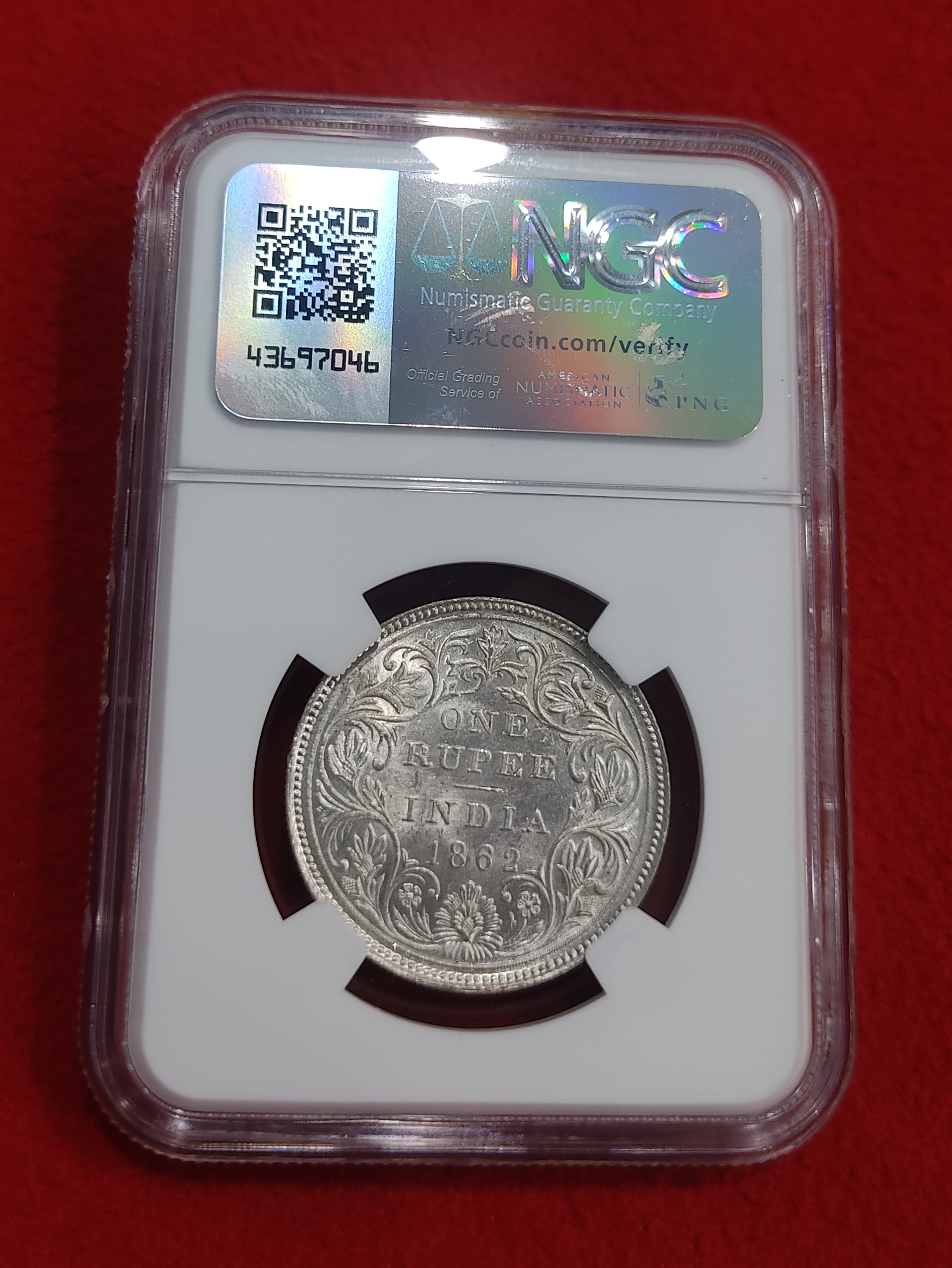 ONE RUPEE SILVER COIN VICTORIA QUEEN GEM UNC CONDITION 1862 CALCUTTA MINT WITH NGC GRADED MS 62