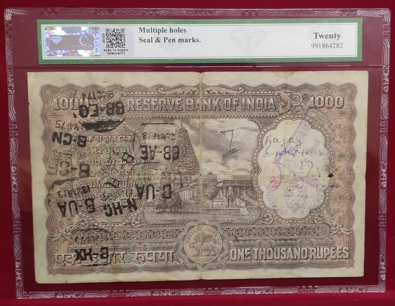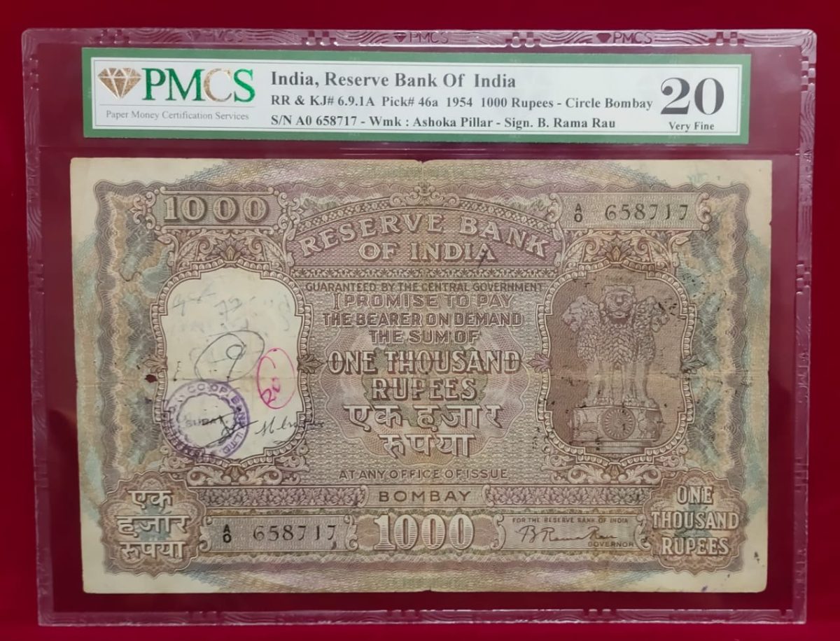 1000 Ruppes Bombay mint Governor B. Ramarao very Rare with Grading 20 very fine condition Super Rare b. Ramarao Governor