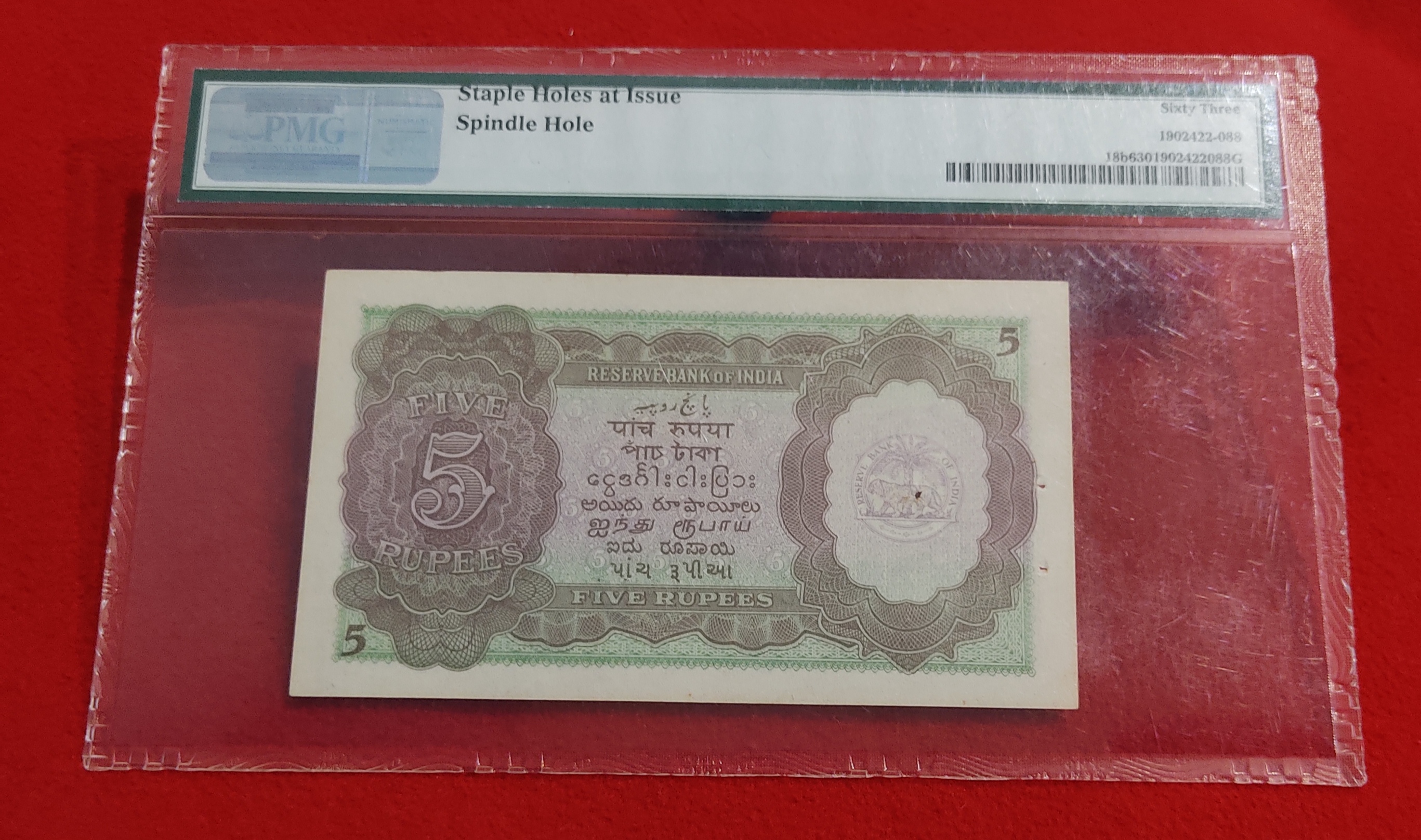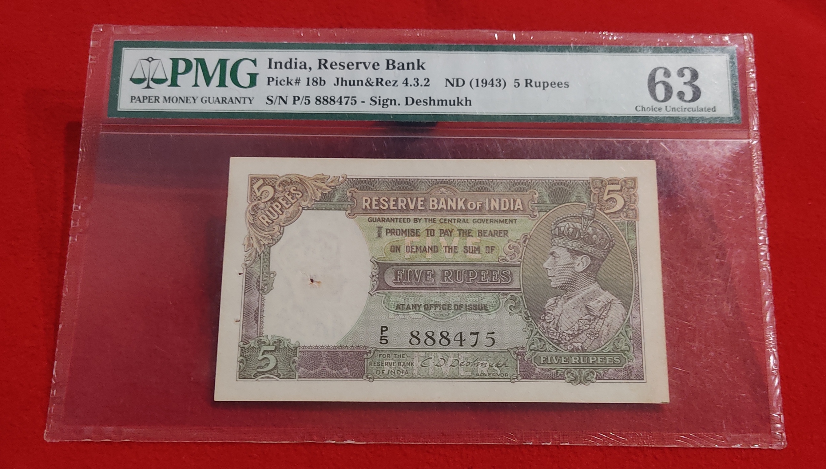 FIVE RUPEES NOTE KING GEORGE VI BRITISH INDIA GOVERNOR C. D. DESHMUCK PMG GRADED UNC CONDITION 63 GRADE SEMI FENCY NUMBER 888475