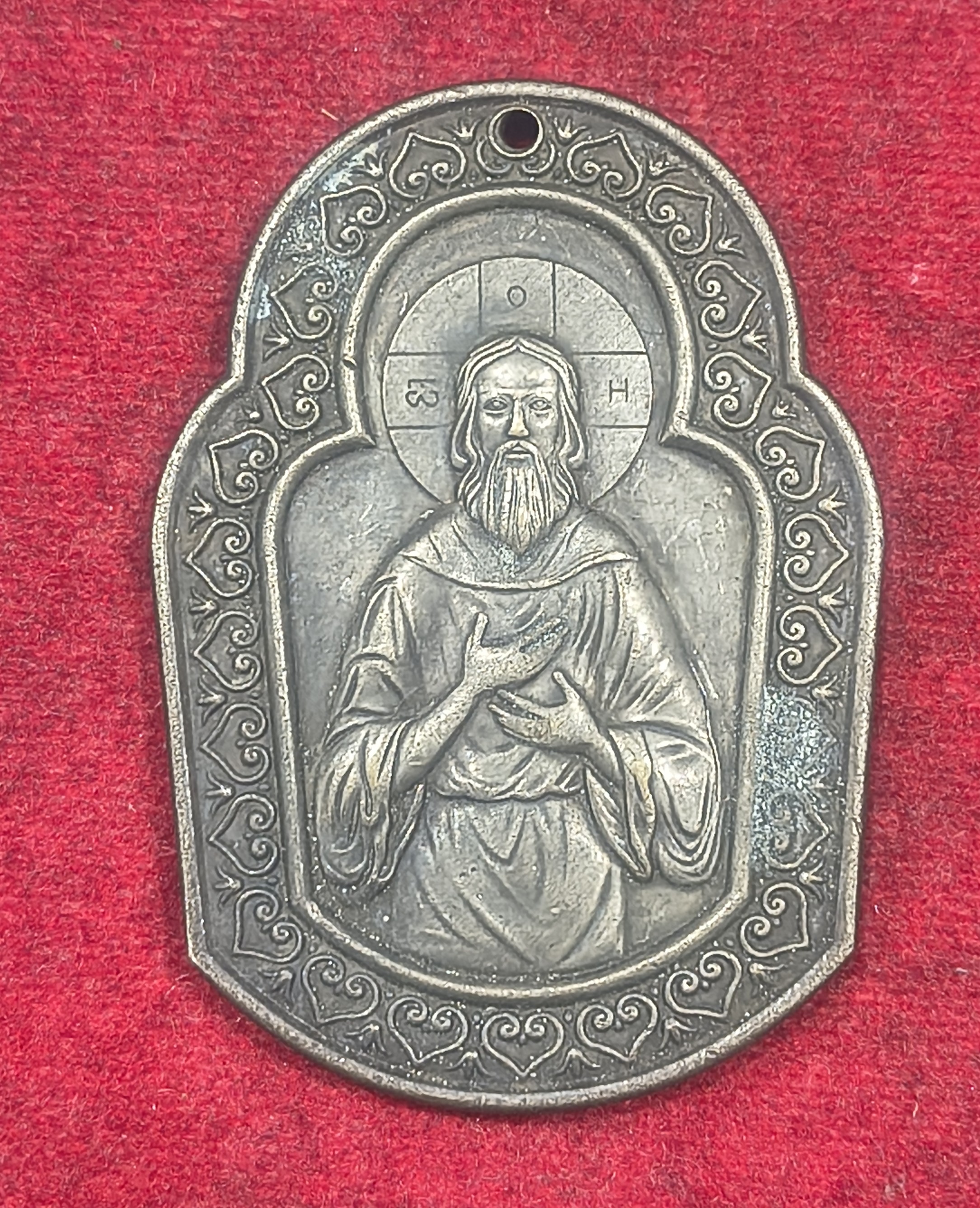 Gorgeous Sloped Rimmed Vintage Etched Hearts Rim Sacred Heart of Jesus Pewter Medal Religious Devotional Christian Necklace #D-43