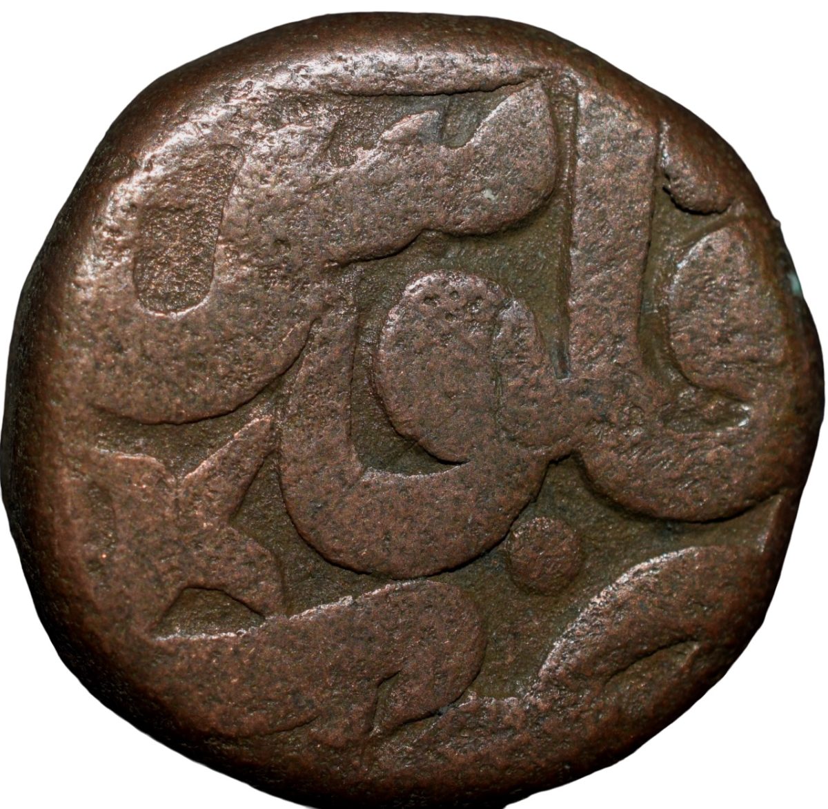 Mughal Empire, Jalal ud-din Muhammad Akbar, (AD 1556-1605), Copper Dam, Obv: zarb Falus from bottom to top, Floral Mint Mark, Rev: Urdu zafar qarin from bottom to top, 18.90 Gms, 20.20 mm, (A.Liddle Type C-9), Very Fine, Scarce with Floral Mint Mark.