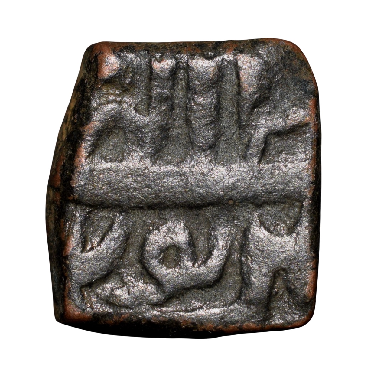 Akbar, (AD 1556-1605), Copper Falus, ilahi type, Obv: Persian Inscription, Rev: ilahi year at Top, Mint name ‘Chainpur’ Bottom, 6.70 Gms, 13.89 x 13.09 mm, Extremely Fine, Rare.